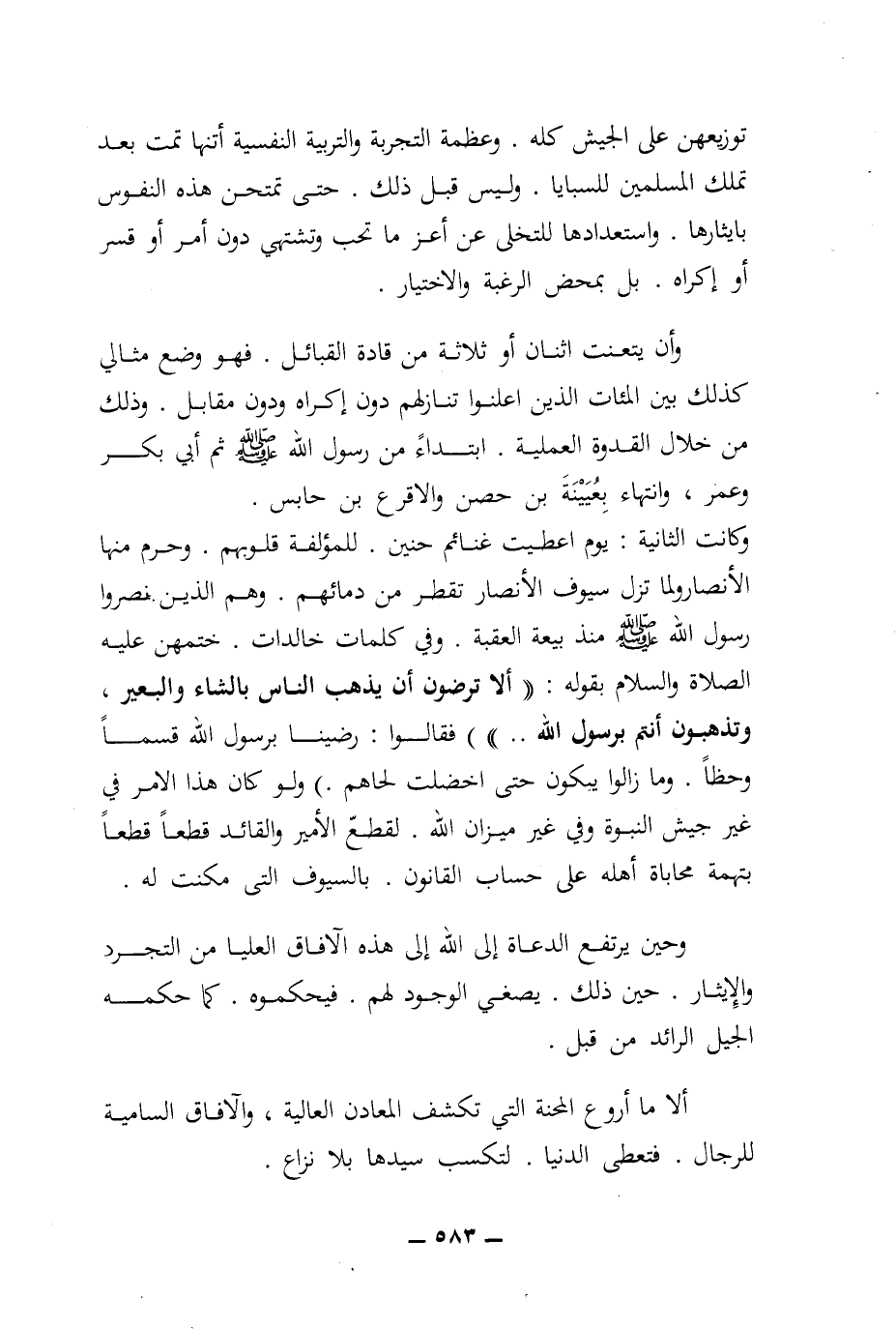 وأن يتعنت اثنان أو ثلاثة من قادة القبائل. فهو وضع مثالي كذلك بين المئات الذين أعلنوا تنازلهم دون إكراه ودون مقابل. وذلك من خلال القدوة العملية. ابتداء من رسول الله (ص) ثم أبي بكر وعمر، وانتهاء بعيينه بن حصن والاقرع بن حابس.