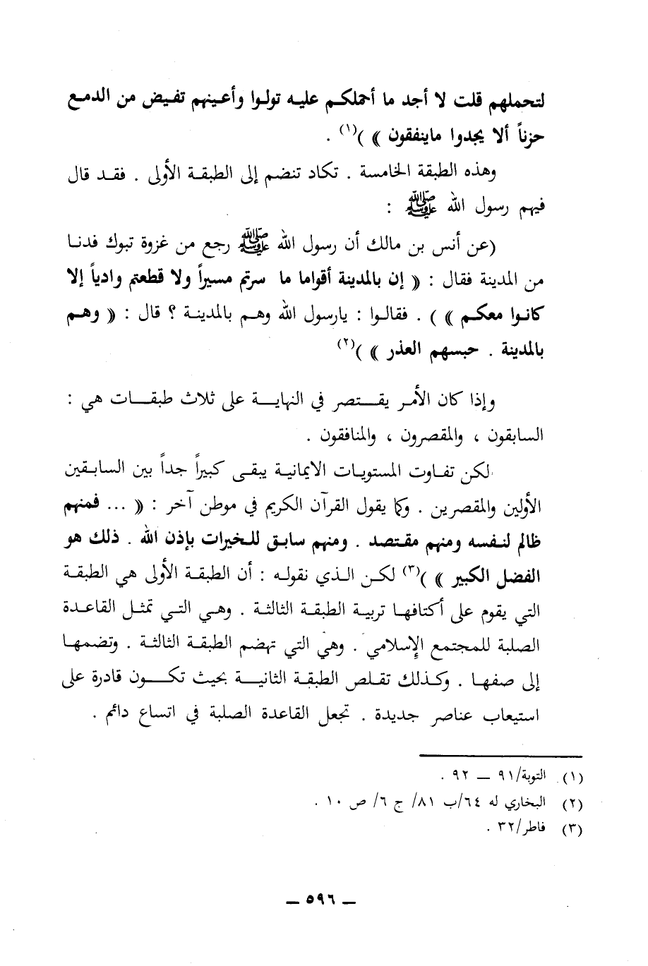لكن تفاوت المستويات الإيمانية يبقى كبيرا جدا بين السابقين الأولين والمقصرين. وكما يقول القرآن الكريم في موطن آخر: {... فمنهم ظالم لنفسه ومنهم مقتصد ومنهم سابق للخيرات بإذن الله ذلك هو الفضل الكبير}) (¬3) لكن الذي نقوله: أن الطبقة الأولى هي الطبقة التي يقوم على أكتافها تربية الطبقة الثالثة. وهي التي تمثل القاعدة الصلبة للمجتمع الإسلامي. وهي التي تهضم الطبقة الثالثة. وتضمها إلى صفها. وكذلك تقلص الطبقة الثانية بحيث تكون قادرة على استيعاب عناصر جديدة. تجعل القاعدة الصلبة في اتساع دائم.