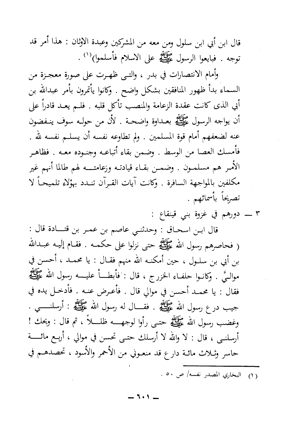 قال ابن إسحاق: وحدثني عاصم بن عمر بن قتادة قال: (فحاصرهم نول الله (ص) حتى نزلوا على حكمه. فقام إليه عبد الله بن أبي بن سلول، حين أمكنه الله منهم فقال: يا محمد، أحسن في موالي. وكانوا حلفاء الخزرج، قال: فأبطأ عليه رسول الله (ص) فقال: يا محمد أحسن في موالي قال. فأعرض عنه. فأدخل يده في جيب درع رسول الله (ص) فقال له رسول الله (ص): أرسلني. وغضب رسول الله (ص) حتى رأوا لوجهه ظللا، ثم قال: ويحك! أرسلني، قال: لا والله لا أرسلك حتى تحسن في موالي، أربع مائة حاسر وثلاث مائة دارع قد منعوني من الأحمر والأسود، تحصدهم في