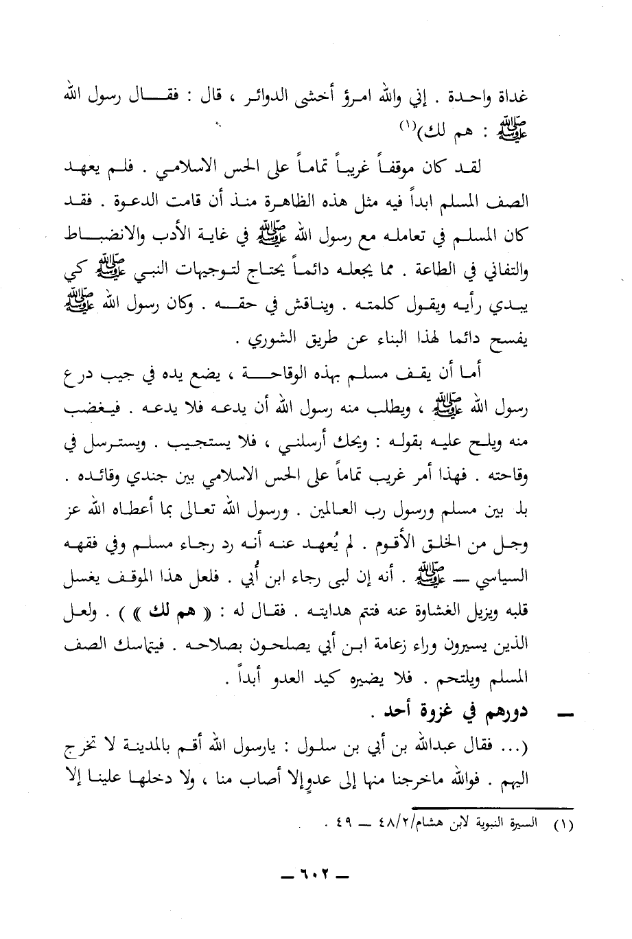 (... فقال عبد الله بن أبي بن سلول: يا رسول الله أقم بالمدينة لا تخرج إليهم. فوالله ما خرجنا منها إلى عدو إلا أصاب منا، ولا دخلها علينا إلا