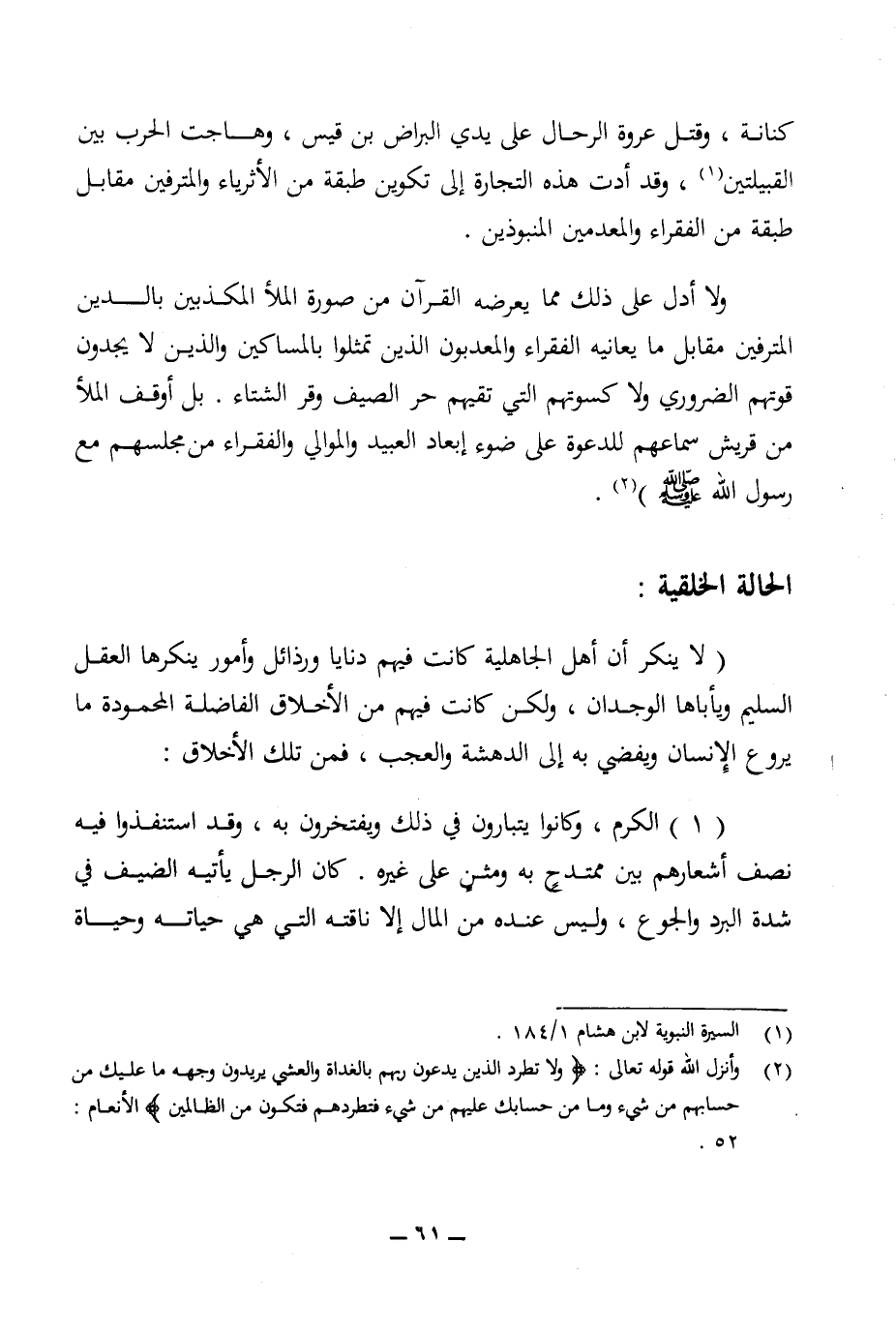 ولا أدل على ذلك مما يعرضه القرآن من صورة الملأ المكذبين بالدين المترفين مقابل ما يعانيه الفقراء والمعذبون الذين تمثلوا بالمساكين والذين لا يجدون قوتهم الضروري ولا كسوتهم التي تقيهم حر الصيف وقر الشتاء. بل أوقف الملأ من قريش سماعهم للدعوة على ضوء إبعاد العبيد والموالي والفقراء من مجلسهم مع رسول الله - صلى الله عليه وسلم -) (¬2).