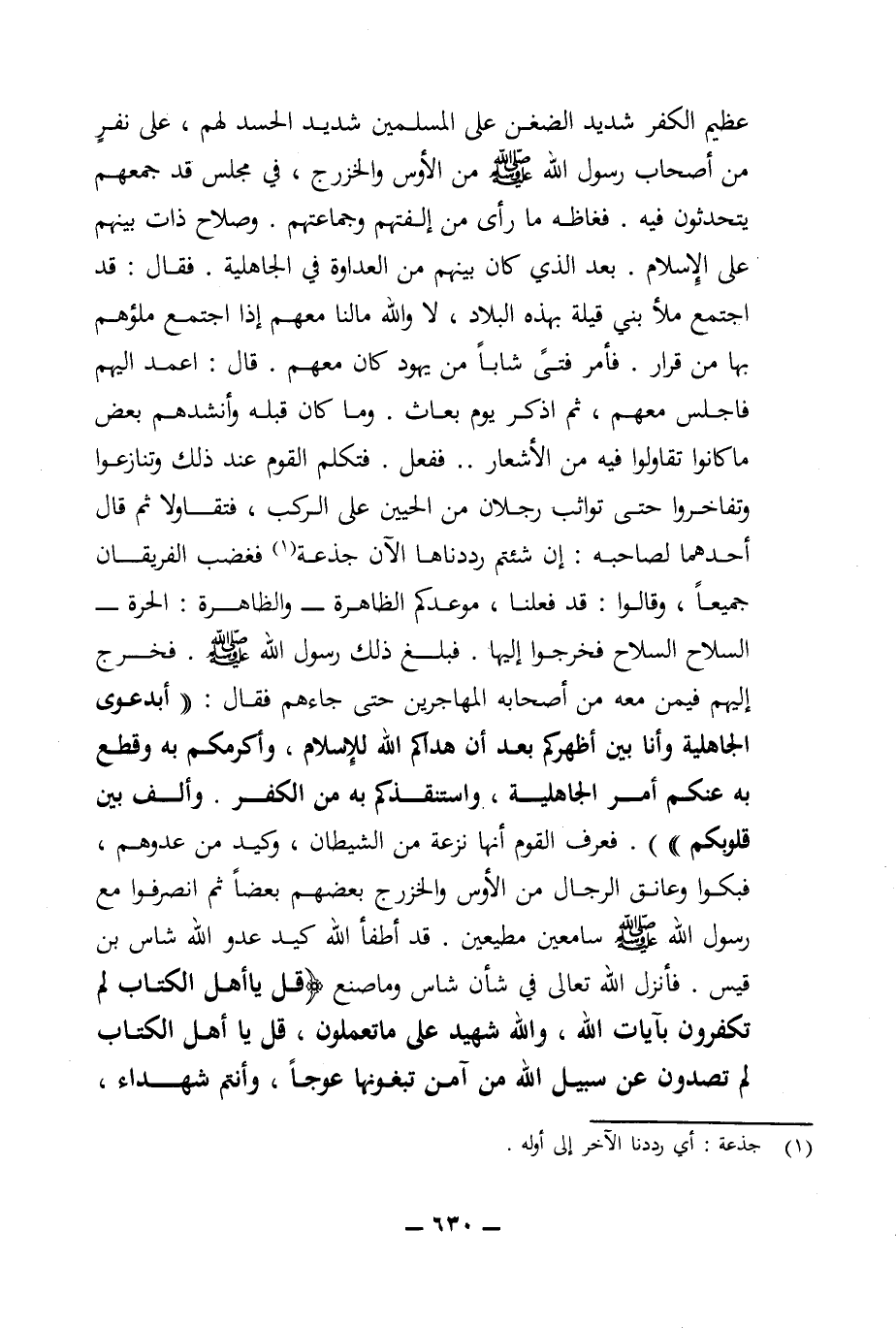 عظيم الكفر شديد الضغن على المسلمين شديد الحسد لهم، على نفر من أصحاب رسول الله (ص) من الأوس والخزرج، في مجلس قد جمعهم يحدثون فيه. فغاظه ما رأى من إلفتهم وجماعتهم. وصلاح ذات بينهم على الإسلام. بعد الذي كان بينهم من العداوة في الجاهلية. فقال: قد اجتمع ملأ بني قيلة بهذه البلاد، لا والله ما لنا معهم إذا اجتمع ملؤهم بها من قرار. فأمر فتى شابا من يهود كان معهم. قال: اعمد اليهم فاجلس معهم، ثم اذكر يوم بعاث. وما كان قبله وأنشدهم بعض ما كانوا تقاولوا فيه من الأشعار .. ففعل. فتكلم القوم عند ذلك وتنازعوا وتفاخروا حتى تواثب رجلان من الحيين على الركب، فتقاولا ثم قال أحدهما لصاحبه: إن شئتم رددناها الآن جذعة (¬1) فغضب الفريقان جميعا، وقالوا: قد فعلنا، موعدكم الظاهرة - والظاهرة: الحرة - السلاح السلاح فخرجوا إليها. فبلغ ذلك رسول الله (ص). فخرج إليهم فيمن معه من أصحابه المهاجرين حتى جاءهم فقال: ((أبدعوى الجاهلية وأنا بين أظهركم بعد أن هداكم الله للإسلام، وأكرمكم به وقطع به عنكم أمر الجاهلية، واستنقذكم به من الكفر. وألف بين قلوبكم))). فعرف القوم أنها نزعة من الشيطان، وكيد من عدوهم، فبكوا وعانق الرجال من الأوس والخزرج بعضهم بعضا ثم انصرفوا مع رسول الله (ص) سامعين مطيعين. قد أطفأ الله كيد عدو الله شاس بن قيس. فأنزل الله تعالى في شأن شاس وما صنع {قل يا أهل الكتاب لم تكفرون بآيات الله والله شهيد على ما تعملون قل يا أهل الكتاب لم تصدون عن سبيل الله من آمن تبغونها عوجا وأنتم شهداء