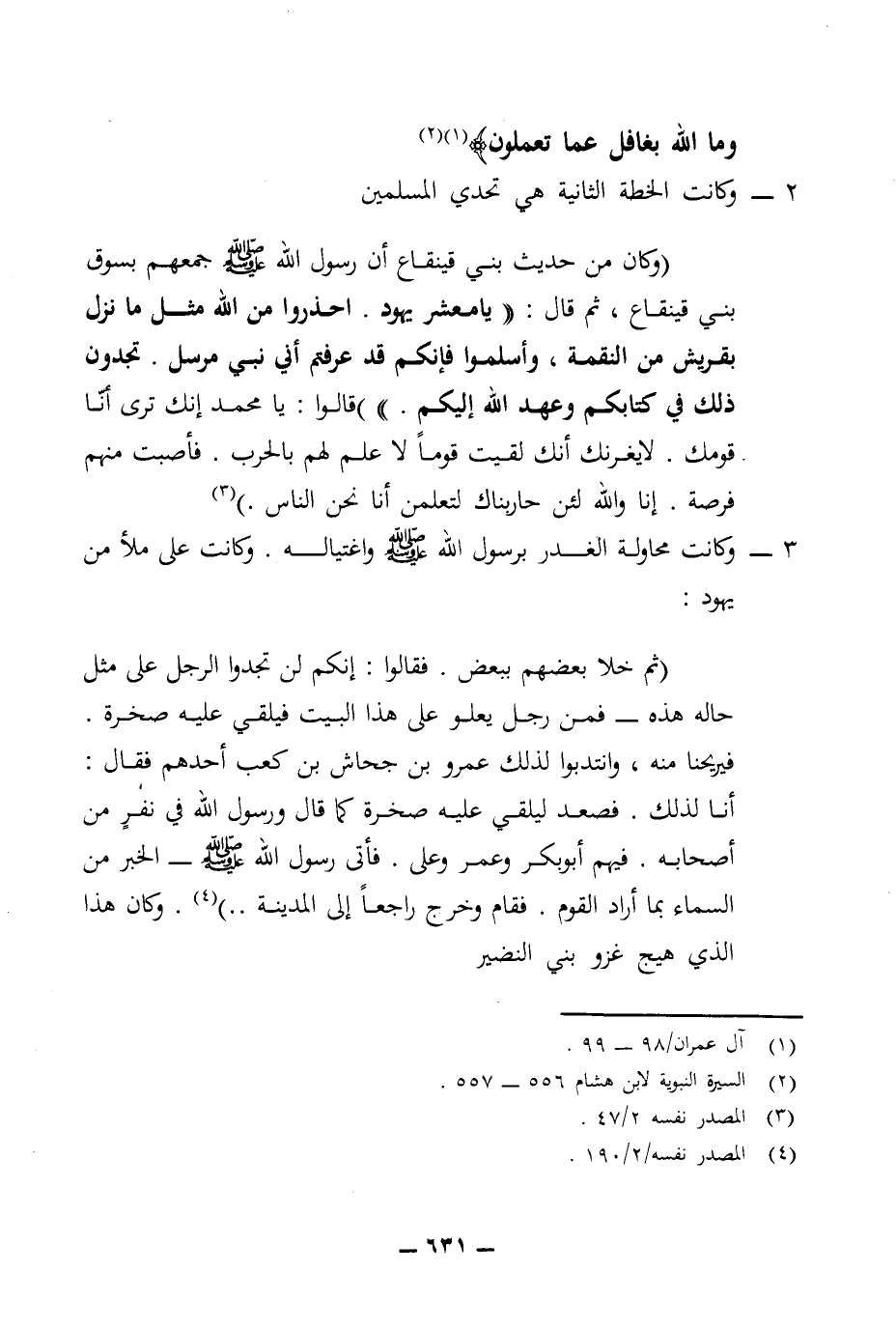 2 - وكانت الخطة الثانية هي تحدي المسلمين (وكان من حديث بني قينقاع أن رسول الله (ص) جمعهم بسوق بني قينقاع، ثم قال: ((يا معشر يهود. احذروا من الله مثل ما نزل بقريش من النقمة، وأسلموا فإنكم قد عرفتم أني نبي مرسل. تجدون ذلك في كتابكم وعهد الله إليكم.)) قالوا: يا محمد إنك ترى أنا قومك. لا يغرنك أنك لقيت قوما لا علم لهم بالحرب. فأصبت منهم فرصة. إنا والله لئن حاربناك لتعلمن أنا نحن الناس.) (¬3).
