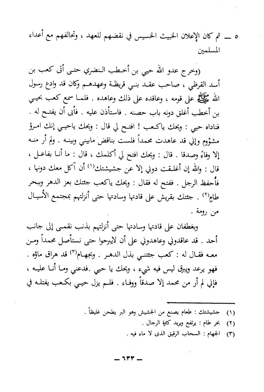 (وخرج عدو الله حيي بن أخطب النضري حتى أتى كعب بن أسد القرظي، صاحب عقد بني قريظة وعهدهم قد وادع رسول الله (ص) على قومه، وعاقده على ذلك وعاهده. فلما سمع كعب بحيي بن أخطب أغلق دونه باب حصنه. فاستأذن عليه. فأبى أن يفتح له.