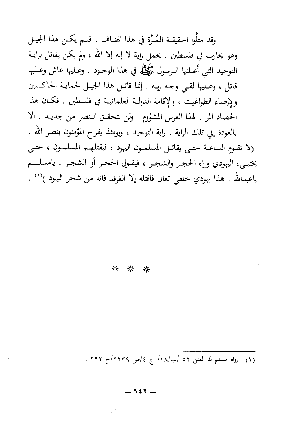وقد مثلوا الحقيقة المرة في هذا الهتاف. فلم يكن هذا الجيل وهو يحارب في فلسطين. يحمل راية لا إله إلا الله، ولم يكن يقاتل براية التوحيد التي أعلنها الرسول (ص) في هذا الوجود. وعليها عاش وعليها قاتل، وعليها لقي وجه ربه .. إنما قاتل هذا الجيل لحماية الحاكمين ولإرضاء الطواغيت، ولإقامة الدولة العلمانية في فلسطين. فكان هذا الحصاد المر. لهذا الغرس المشؤوم. ولن يتحقق النصر من جديد. إلا بالعودة إلى تلك الراية. راية التوحيد، ويومئذ يفرح المؤمنون بنصر الله.