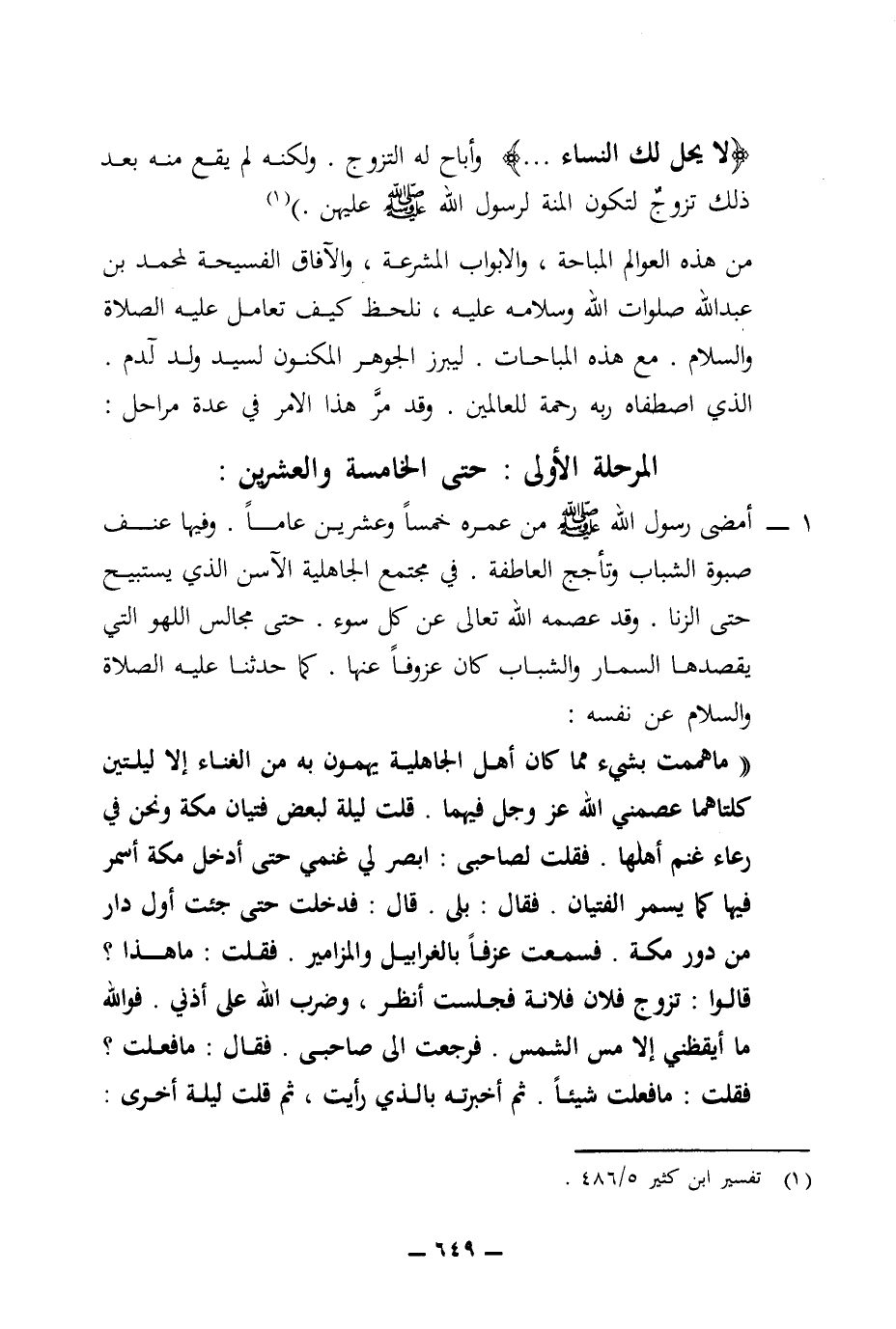 1 - أمضى رسول الله (ص) من عمره خمسا وعشرين عاما. وفيها عنف صبوة الشباب وتأجج العاطفة. في مجتمع الجاهلية الآسن الذي يستبيح حتى الزنا. وقد عصمه الله تعالى عن كل سوء. حتى مجالس اللهو التي يقصدها السمار والشباب كان عزوفا عنها. كما حدثنا عليه الصلاة والسلام عن نفسه: