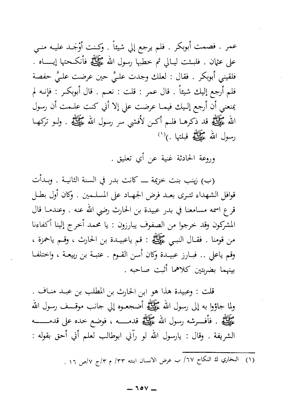(ب) زينب بنت خزيمة - كانت بدر في السنة الثانية. وبدأت قوافل الشهداء تترى بعد فرض الجهاد على المسلمين. وكان أول بطل قرع اسمه مسامعنا في بدر عبيدة بن الحارث رضي الله عنه. وعندما قال المشركون وقد خرجوا من الصفوف يبارزون: يا محمد أخرج إلينا أكفاءنا من قومنا. فقال النبي (ص): قم يا عبيدة بن الحارث، وقم يا حمزة، وقم ياعلي .. فبارز عبيدة وكان أسن القوم. عتبة بن ربيعة، واختلفا بينهما بضربتين كلاهما أثبت صاحبه.