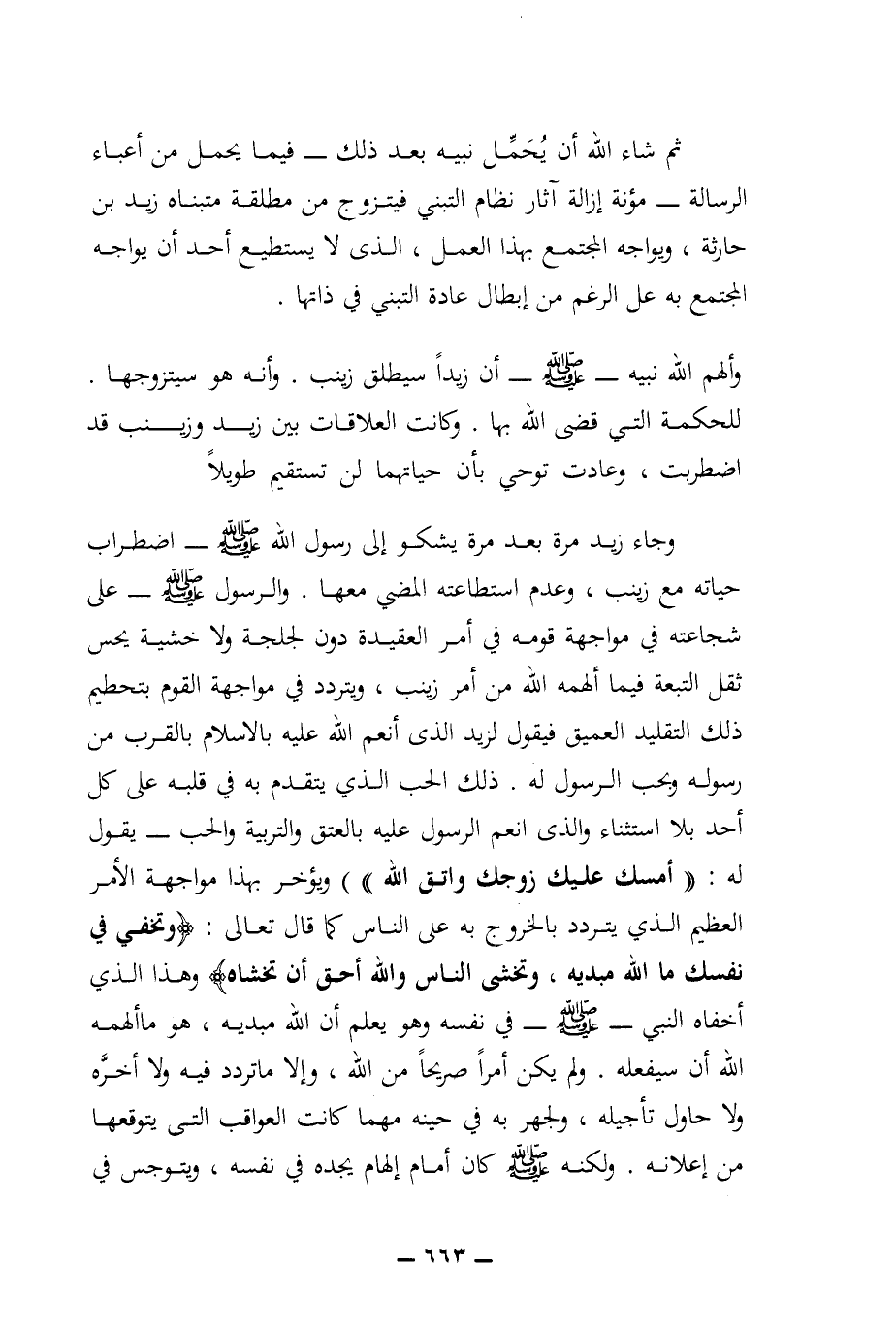 وجاء زيد مرة بعد مرة يشكو إلى رسول الله (ص) اضطراب حياته مع زينب، وعدم استطاعته المضي معها. والرسول (ص) على شجاعته في مواجهة قومه في أمر العقيدة دون لجلجة ولا خشية يحس ثقل التبعة فيما ألهمه الله من أمر زينب، ويتردد في مواجهة القوم بتحطيم ذلك التقليد العميق فيقول لزيد الذي أنعم الله عليه بالإسلام بالقرب من رسوله وبحب الرسول له. ذلك الحب الذي يتقدم به في قلبه على كل أحد بلا استثناء والذي أنعم الرسول عليه بالعتق والتربية والحب - يقول له: {أمسك عليك زوجك واتق الله}) ويؤخر بهذا مواجهة الأمر العظيم الذي يتردد بالخروج به على الناس كما قال تعالى: {وتخفي في نفسك ما الله مبديه وتخشى الناس والله أحق أن تخشاه} وهذا الذي أخفاه النبي - (ص) - في نفسه وهو يعلم أن الله مبديه، هو ما ألهمه الله أن سيفعله. ولم يكن أمرا صريحا من الله، وإلا ما تردد فيه ولا أخره ولا حاول تأجيله، ولجهر به في حينه مهما كانت العواقب التي يتوقعها من إعلانه. ولكنه (ص) كان أمام إلهام يجده في نفسه، ويتوجس في