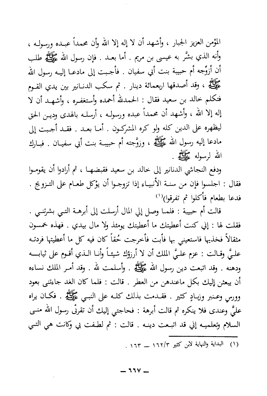 المؤمن العزيز الجبار، وأشهد أن لا إله إلا الله وأن محمدا عبده ورسوله، وأنه الذي بشر به عيسى بن مريم. أما بعد. فإن رسول الله (ص) طلب أن أزوجه أم حبيبة بنت أبي سفيان. فأجبت إلى ما دعا إليه رسول الله (ص)، وقد أصدقها أربعمائة دينار. ثم سكب الدنانير بين يدي القوم فتكلم خالد بن سعيد فقال: الحمد لله أحمده وأستغفره، وأشهد أن لا إله إلا الله، وأشهد أن محمدا عبده ورسوله، أرسله بالهدى ودين الحق ليظهره على الدين كله ولو كره المشركون. أما بعد. فقد أجبت إلى ما دعا إليه رسول الله (ص)، وزوجته أم حبيبة بنت أبي سفيان. فبارك الله لرسوله (ص).