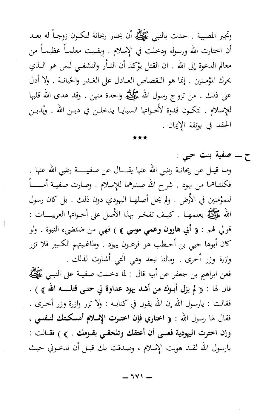 وما قيل عن ريحانة رضي الله عنها يقال عن صفية رضي الله عنها. فكلتاهما من يهود. شرح الله صدرهما للإسلام. وصارت صفية أما للمؤمنين في الأرض. ولم يحل أصلها اليهودي دون ذلك. بل كان رسول الله يعلمها. كيف تفخر بهذا الأصل على أخواتها العربيات: قولي لهم: ((أبي هارون وعمي موسى)) فهي من ضئضىء النبوة. ولو كان أبوها حيي بن أخطب هو فرعون يهود. وطاغيتهم الكبير فلا تزر وازرة وزر أخرى. وما لنا نبعد وهي التي أشارت لذلك.