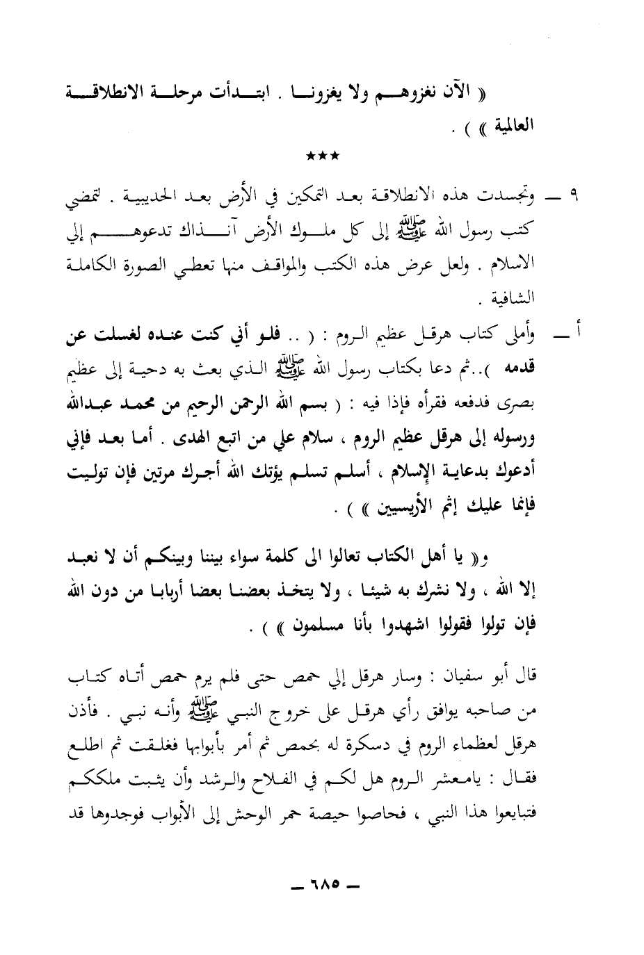 أ - وأملى كتاب هرقل عظيم الروم: (.. فلو أني كنت عنده لغسلت عن قدمه) .. ثم دعا بكتاب رسول الله (ص) الذي بعث به دحية إلى عظيم بصرى فدفعه فقرأه فإذا فيه: (بسم الله الرحمن الرحيم من محمد عبد الله ورسوله إلى هرقل عظيم الروم، سلام على من اتبع الهدى. أما بعد فإني أدعوك بدعاية الإسلام، أسلم تسلم يؤتك الله أجرك مرتين فإن توليت فإنما عليك إثم الأريسيين))).