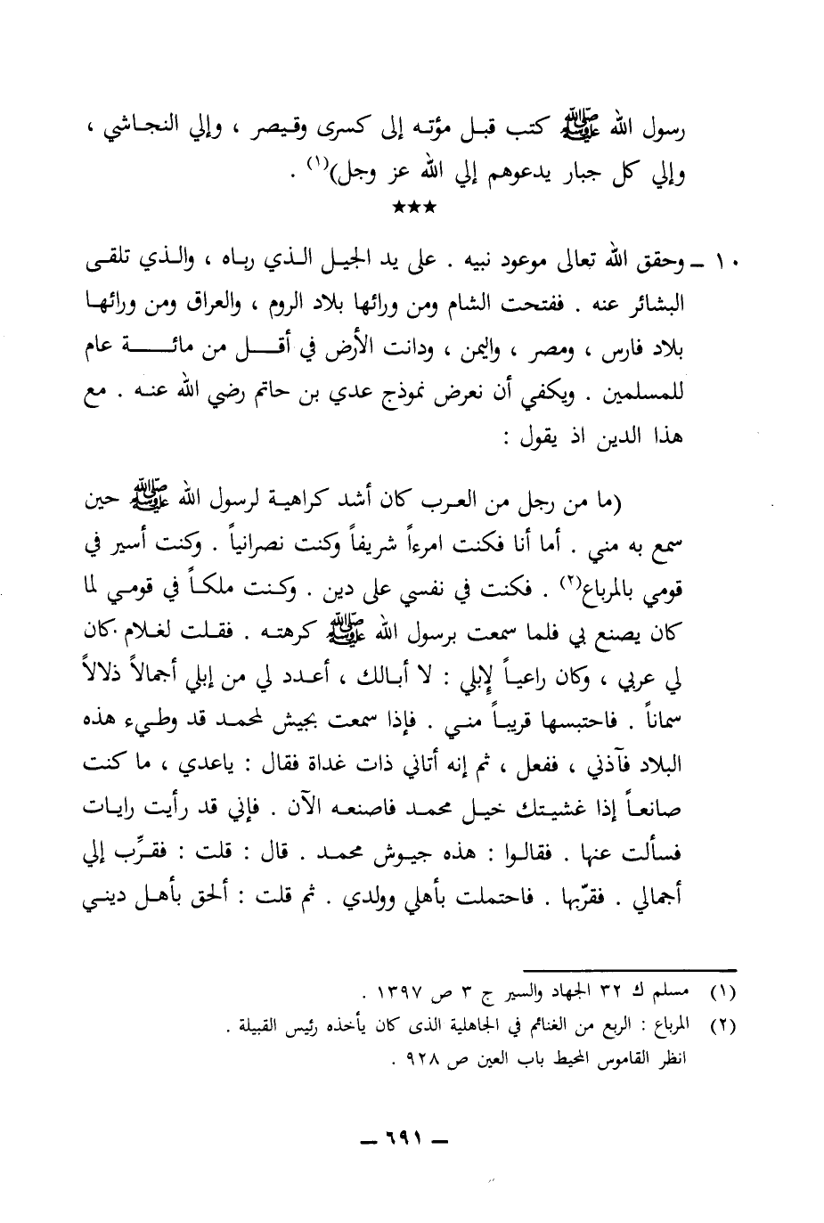 10 - وحقق الله تعالى موعود نبيه. على يد الجيل الذي رباه، والذي تلقى البشائر عنه. ففتحت الشام ومن ورائها بلاد الروم، والعراق ومن ورائها بلاد فارس، ومصر، واليمن، ودانت الأرض في أقل من مائة عام للمسلمين. ويكفي أن نعرض نموذج عدي بن حاتم رضي الله عنه. مع هذا الدين إذ يقول: