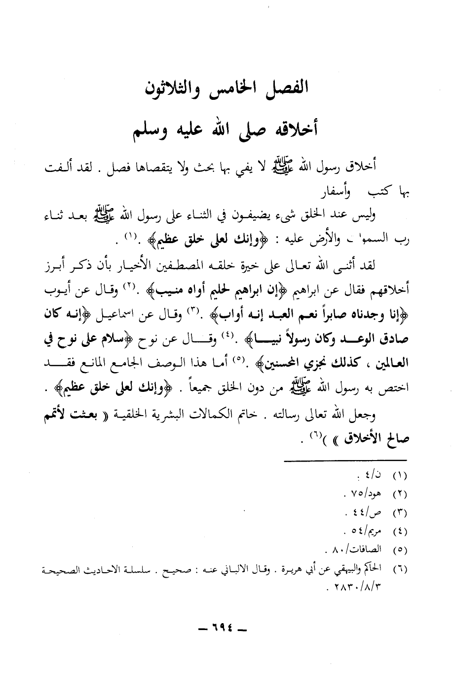 لقد أثنى الله تعالى على خيرة خلقه المصطفين الأخيار بأن ذكر أبرز أخلاقهم فقال عن إبراهبم {إن إبراهيم لحليم أواه منيب}. (¬2) وقال عن أيوب {إنا وجدناه صابرا نعم العبد إنه أواب}. (¬3) وقال عن إسماعيل {إنه كان صادق الوعد وكان رسولا نبيا}. (¬4) وقال عن نوح {سلام على نوح في العالمين كذلك نجزي المحسنين}. (¬5) أما هذا الوصف الجامع المانع فقد اختص به رسول الله (ص) من دون الخلق جميعا. {وإنك لعلى خلق عظيم}.