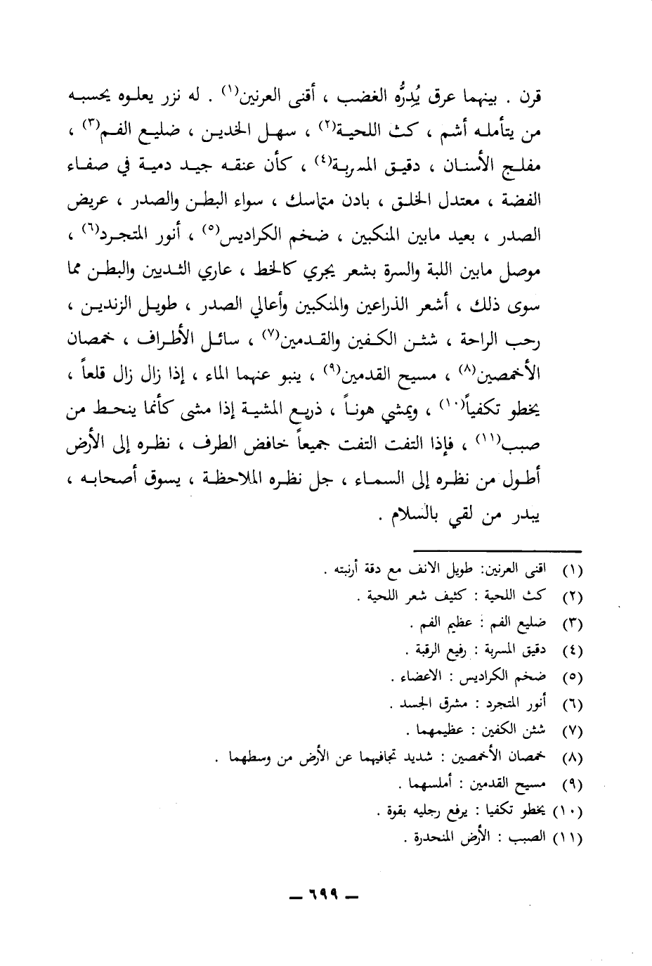 قرن. بينهما عرق يدره الغضب، أقنى العرنين (¬1). له نزر يعلوه يحسبه من يتأمله أشم، كث اللحية (¬2)، سهل الخدين، ضليع الفم (¬3)، مفلح الأسنان، دقيق المسربة (¬4)، كأن عنقه جيد دمية في صفاء الفضة، معتدل الخلق، بادن متماسك، سواء البطن والصدر، عريض الصدر، بعيد ما بين المنكبين، ضخم الكراديس (¬5)، أنور المتجرد (¬6)، موصل ما بين اللبة والسرة بشعر يجري كالخط، عاري الثديين والبطن مما سوى ذلك، أشعر الذراعين والمنكبين وأعالي الصدر، طويل الزندين، رحب الراحة، شثن الكفين والقدمين (¬7)، سائل الأطراف، خمصان الأخمصين (¬8)، مسيح القدمين (¬9)، ينبو عنهما الماء، إذا زال زال قلعا، يخطو تكفيا (¬10)، ويمشي هونا، ذريع المشية إذا مشى كأنما ينحط من صبب (¬11)، فإذا التفت التفت جميعا خافض الطرف، نظره إلى الأرض أطول من نظره إلى السماء، جل نظره الملاحظة، يسوق أصحابه، يبدر من لقي بالسلام.