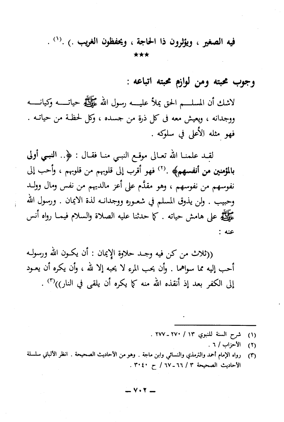 لقد علمنا الله تعالى موقع النبي منا فقال: {.. النبي أولى بالمؤمنين من أنفسهم}. (¬2) فهو أقرب إلى قلوبهم من قلوبهم، وأحب إلى نفوسهم من نفوسهم، وهو مقدم على أعز ما لديهم من نفس ومال وولد وحبيب. ولن يذوق المسلم في شعوره ووجدانه لذة الإيمان. ورسول الله (ص) على هامش حياته. كما حدثنا عليه الصلاة والسلام فيما رواه أنس عنه: