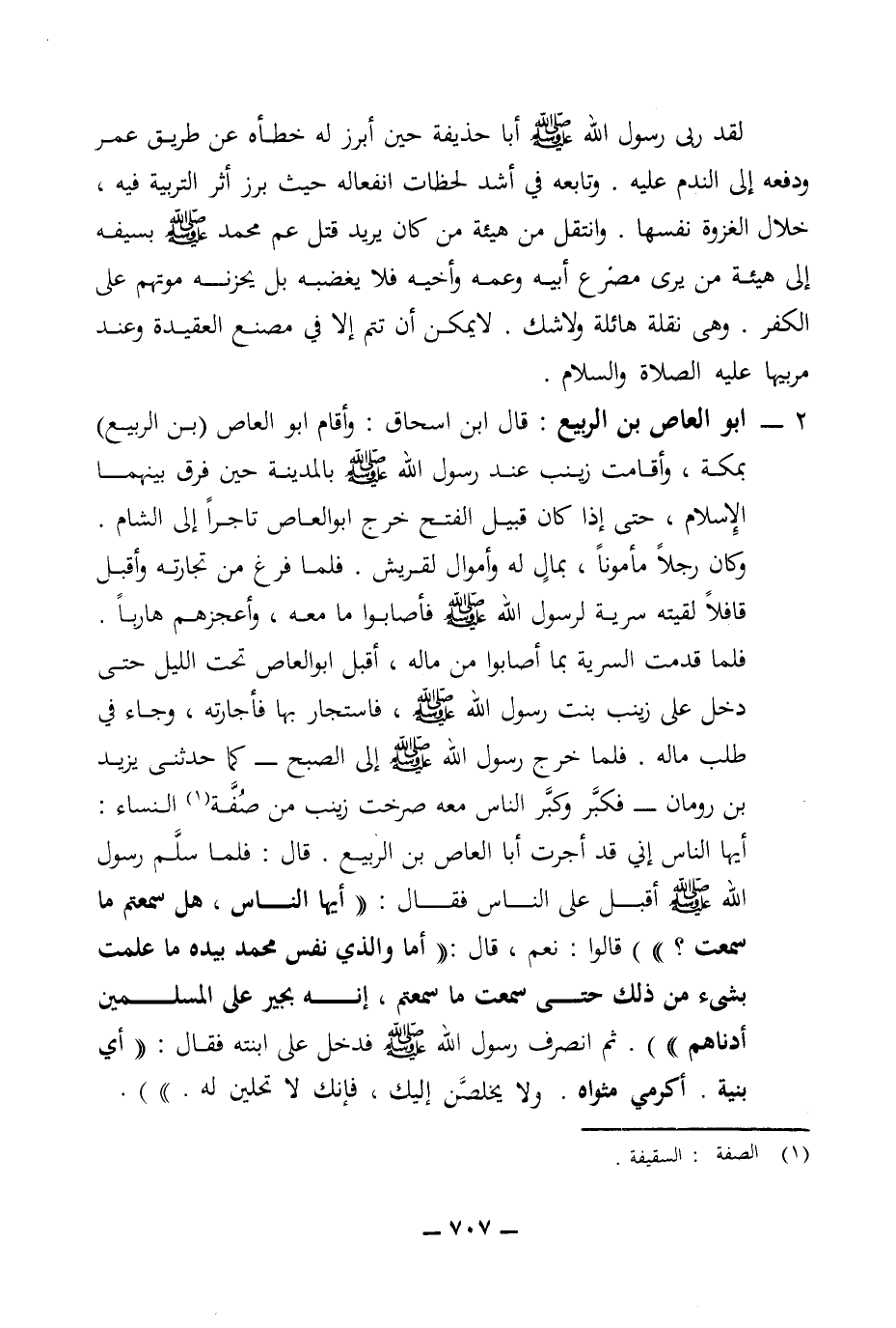 2 - أبو العاص بن الربيع: قال ابن اسحاق: وقام أبو العاص (بن الربيع) بمكة، وأقامت زينب عند رسول الله (ص) بالمدينة حين فرق بينهما الإسلام، حتى إذا كان قبيل الفتح خرج أبو العاص تاجرا إلى الشام. وكان رجلا مأمونا، بمال له وأموال لقريش. فلما فرغ من تجارته وأقبل قافلا لقيته سرية لرسول الله (ص) فأصابوا ما معه، وأعجزهم هاربا. فلما قدمت السرية بما أصابوا من ماله، أقبل أبو العاص تحت الليل حتى دخل على زينب بنت رسول الله (ص)، فاستجار بها فأجارته، وجاء في طلب ماله. فلما خرج رسول الله (ص) إلى الصبح - كما حدثني يزيد بن رومان - فكبر وكبر الناس معه صرخت زينب من صفة (¬1) النساء: أيها الناس إني قد أجرت أبا العاص بن الربيع. قال: فلما سلم رسول الله (ص) أقبل على الناس فقال: ((أيها الناس، هل سمعتم ما سمعت؟)) قالو: نعم، قال: ((أما والذي نفس محمد بيده ما علمت بشيء من ذلك حتى سمعت ما سمعتم، إنه تجير على المسلمين أدناهم)).ثم انصرق رسول الله (ص). فدخل على ابنته فقال: ((أي بنية. أكرمي مثواه. ولا يخلصن إليك، فإنك لا تحلين له.))).