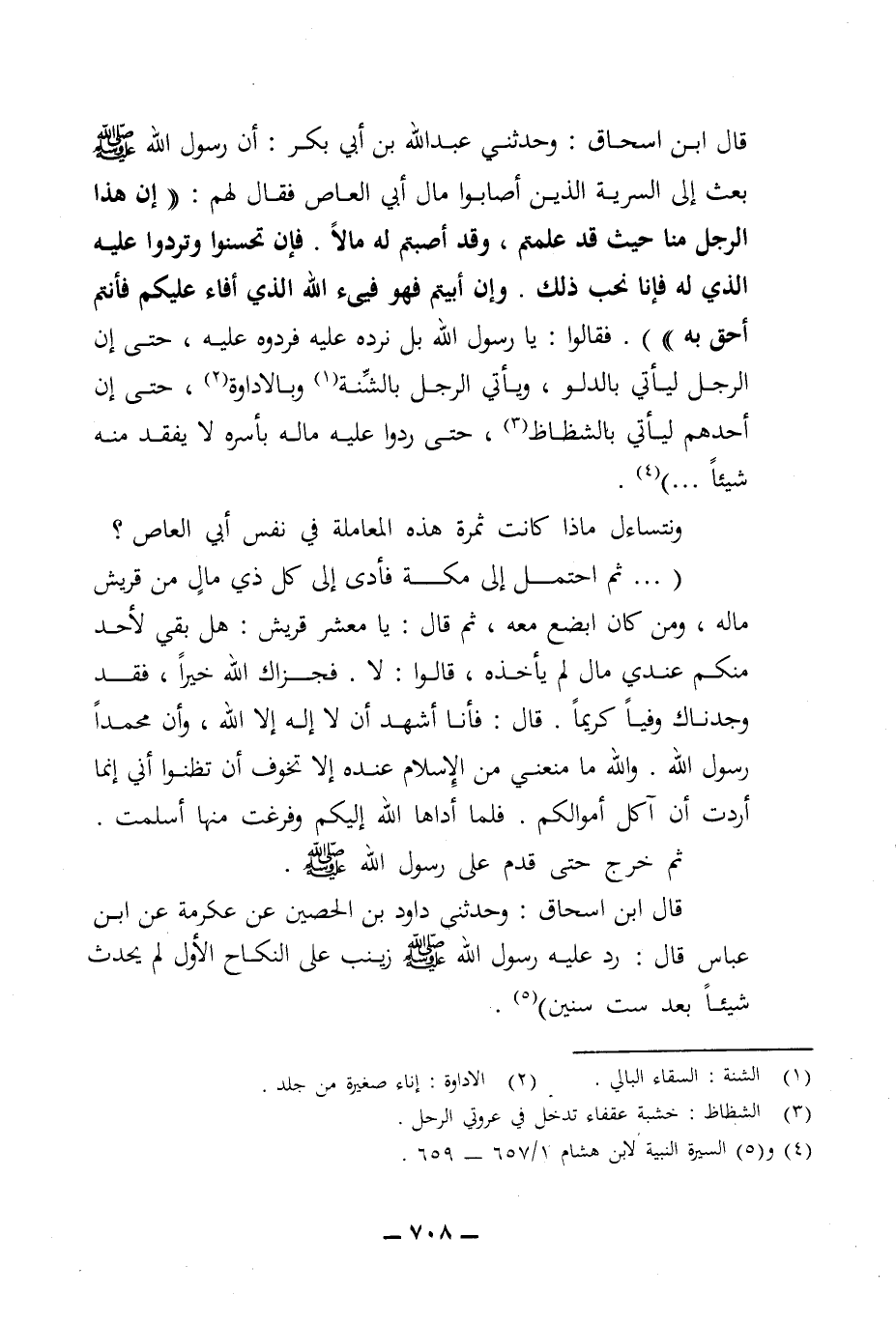 قال ابن اسحاق: وحدثني عبد الله بن أبي بكر: أن رسول الله (ص) بعث إلى السرية الذين أصابوا مال أبي العاص فقال لهم: ((إن هذا الرجل منا حيث قد علمتم، وقد أصبتم له مالا. فإن تحسنوا وتردوا عليه الذي له فإنا نحب ذلك. وإن أبيتم فهو فيء الله الذي أفاء عليكم فأنتم أحق به))). فقالوا: يا رسول الله بل نرده عليه فردوه عليه، حتى إن الرجل ليأتي بالدلو، ويأتي الرجل بالشنة (¬1) وبالاداوة (¬2)، حتى إن أحدهم ليأتي بالشظاظ (¬3)، حتى ردوا عليه ماله بأسره لا يفقد منه شيئا ...) (¬4).