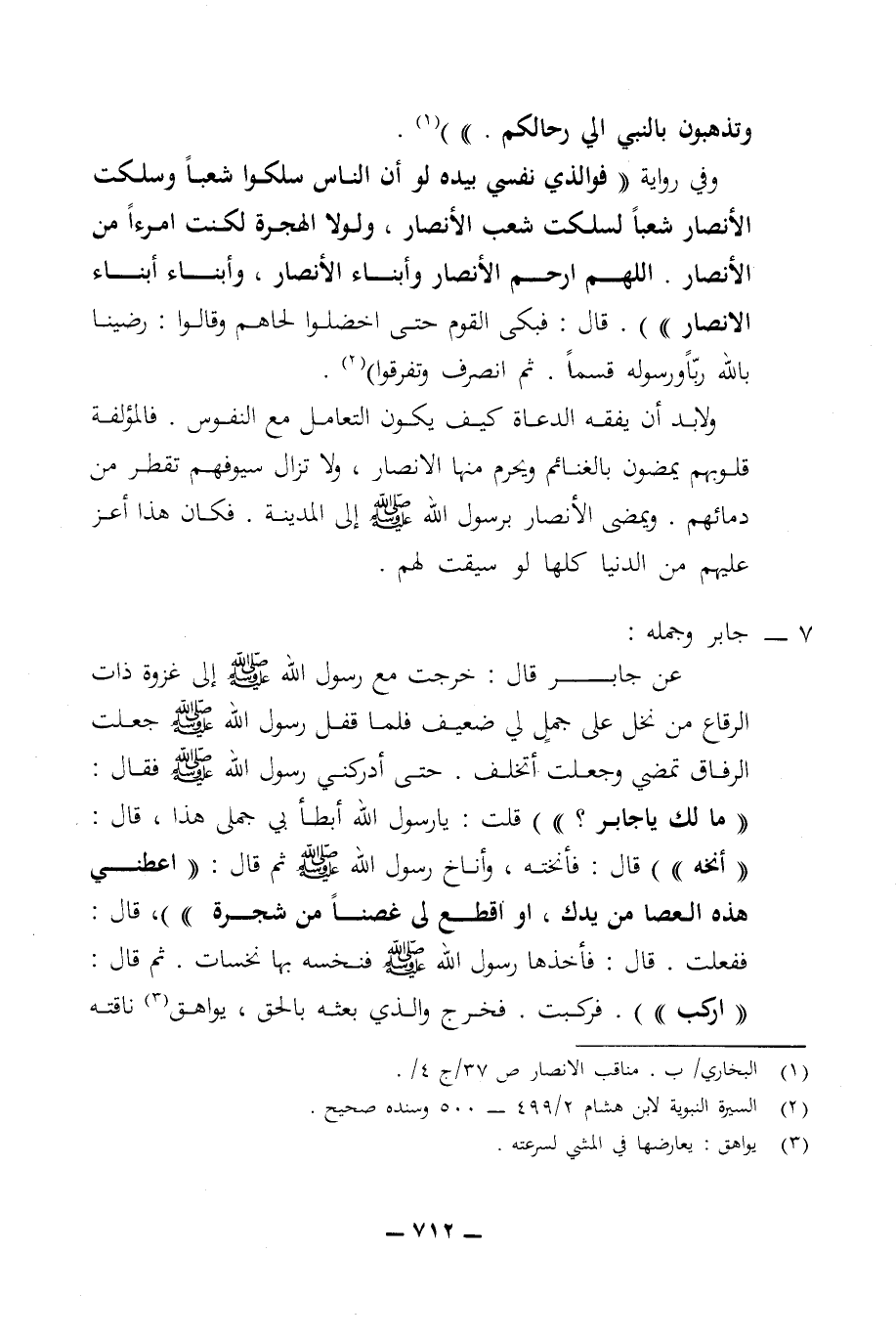 عن جابر قال: خرجت مع رسول الله (ص) إلى غزوة ذات الرقاع من نخل على جمل لي ضعيف فلما قفل رسول الله (ص) جعلت الرفاق تمضي وجعلت أتخلف. حتى أدركني رسول الله (ص) فقال: ((ما لك يا جابر؟))) قلت: يا رسول الله أبطأ بي جملي هذا، قال: ((أنخه))) قال: فأنخته، وأناخ رسول الله (ص) ثم قال: ((اعطني هذه العصا من يدك، أو اقطع لي غصنا من شجرة)))، قال: ففعلت. قال: فأخذها رسول الله (ص) فنخسه بها نخسات. ثم قال: ((اركب))). فركبت. فخرج والذي بعثه بالحق، يواهق (¬3) ناقته