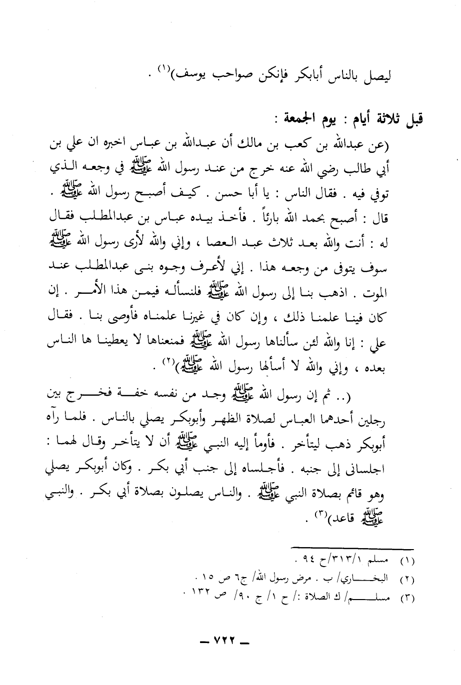 (.. ثم إن رسول الله (ص) وجد من نفسه خفة فخرج بين رجلين أحدهما العباس لصلاة الظهر وأبو بكر يصلي بالناس. فلما رآه أبو بكر ذهب ليتأخر. فأومأ إليه النبي (ص) أن لا يتأخر وقال لهما: اجلساني إلى جنبه. فأجلساه إلى جنب أبي بكر. وكان أبو بكر يصلي وهو قائم بصلاة النبي (ص). والناس يصلون بصلاة أبي بكر. والنبي