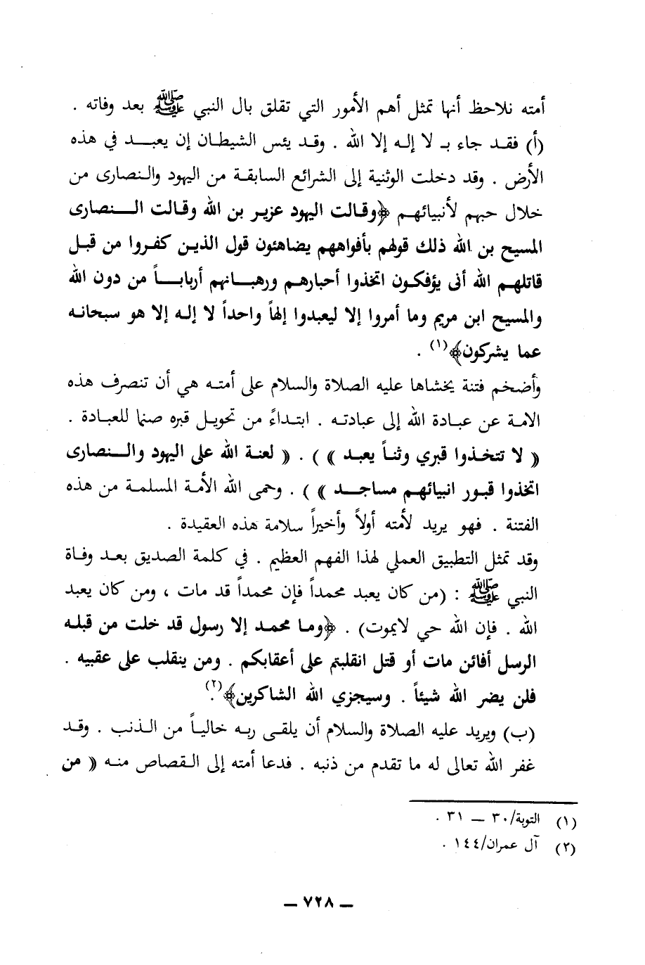وقد تمثل التطبيق العملي لهذا الفهم العظيم. في كلمة الصديق بعد وفاة النبي (ص): (من كان يعبد محمدا فإن محمدا قد مات، ومن كان يعبد الله. فإن الله حي لا يموت). {وما محمد إلا رسول قد خلت من قبله الرسل أفائن مات أو قتل انقلبتم على أعقابكم ومن ينقلب على عقبيه فلن يضر الله شيئا وسيجزي الله الشاكرين} (¬2).