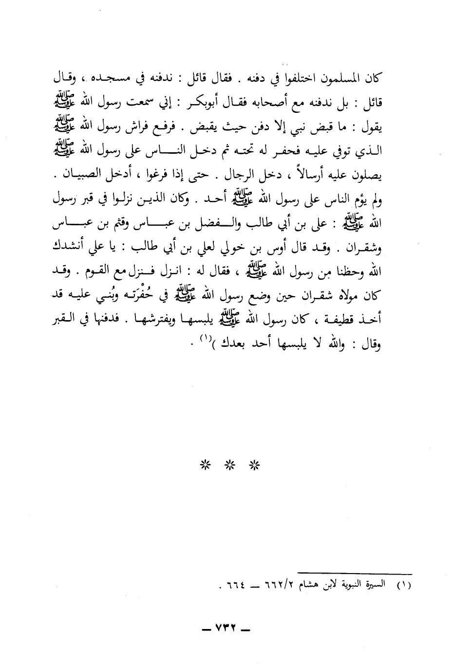 كان المسلمون اختلفوا في دفنه. فقال قائل: ندفنه في مسجده، وقال قائل: بل ندفنه مع أصحابه فقال أبو بكر: إني سمعت رسول الله (ص) يقول: ما قبض نبي إلا دفن حيث يقبض. فرفع فراش رسول الله (ص) الذي توفي عليه فحفر له تحته ثم دخل الناس على رسول الله (ص) يصلون عليه أرسالا، دخل الرجال. حتى إذا فرغوا، أدخل الصبيان. ولم يؤم الناس على رسول الله (ص) أحد. وكان الذين نزلوا في قبر رسول الله (ص): علي بن أبي طالب والفضل بن عباس وقثم بن عباس وشقران. وقد قال أوس بن خولي لعلي بن أبي طالب: يا علي أنشدك الله وحظنا من رسول الله (ص)، فقال له: انزل فنزل مع القوم. وقد كان مولاه شقران حين وضع رسول الله (ص) في حفرته وبني عليه قد أخذ قطيفة، كان رسول الله (ص) يلبسها ويفترشها. فدفنها في القبر وقال: والله لا يلبسها أحد بعدك) (¬1).