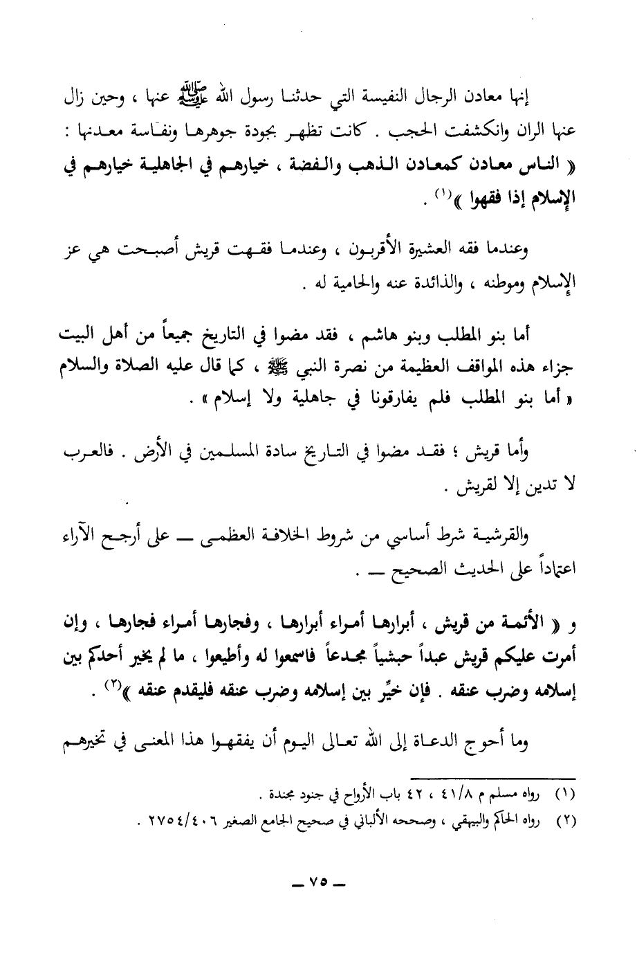 وأما قريش. فقد مضيا في التاريخ سادة المسلمين في الأرض. فالعرب لا تدين إلا لقريش.