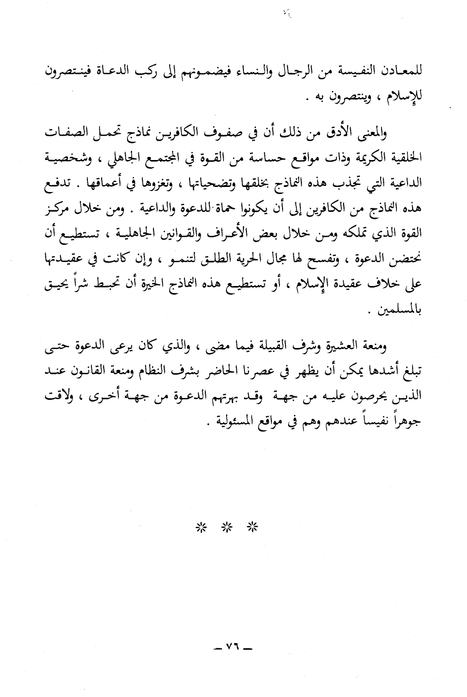 ومنعة العشيرة وشرف القبيلة فيما مضى، والذي كان يرعى الدعوة حتى تبلغ أشدها يمكن أن يظهر في عصرنا الحاضر بشرف النظام ومنعة القانون عند الذين يحرصون عليه من جهة وقد بهرتهم الدعوة من جهة أخرى، ولاقت جوهرا نفيسا عندهم وهم في مواقع المسئولية.