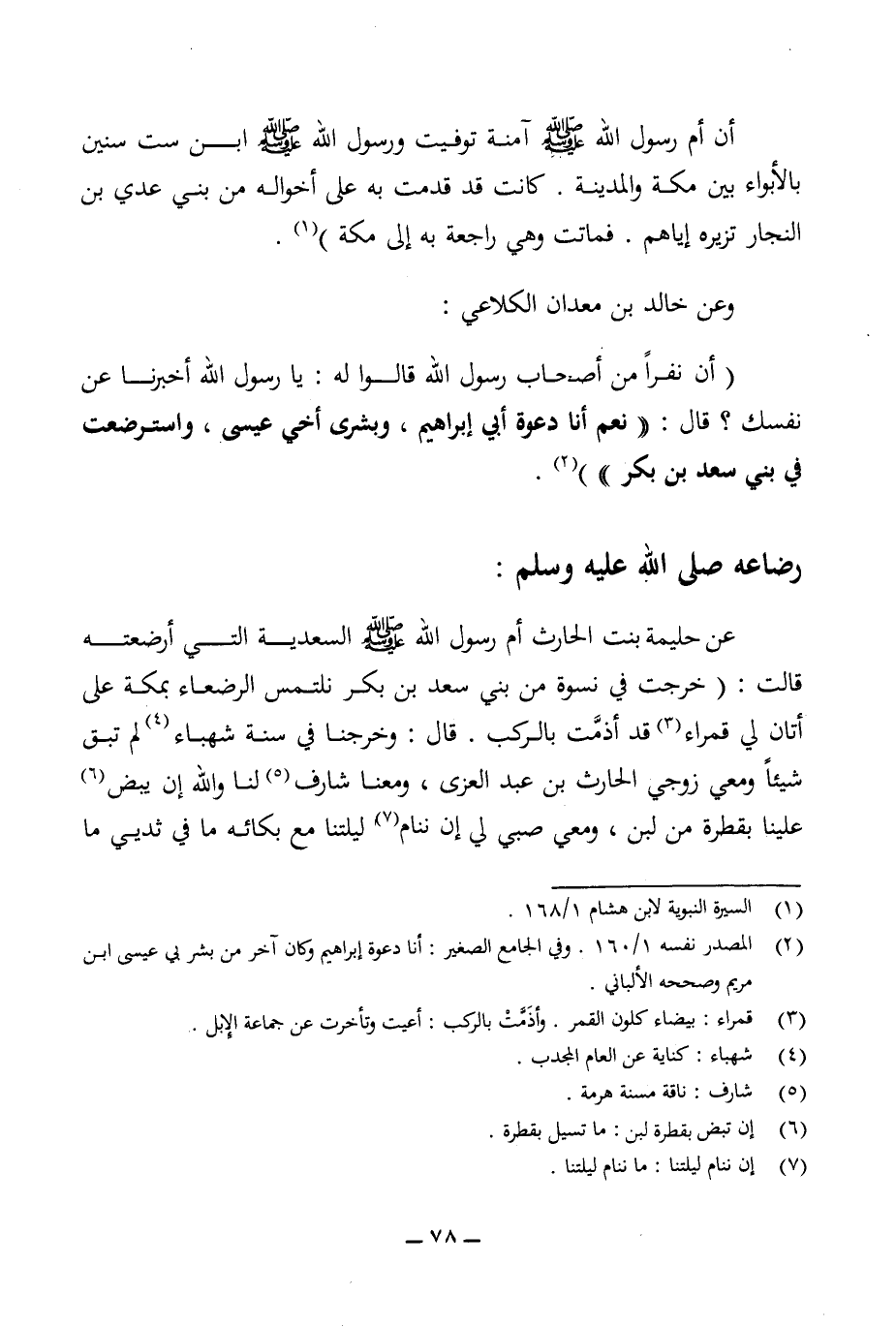عن حليمة بنت الحارث أم رسول الله - صلى الله عليه وسلم - السعدية التي أرضعته قالت: (خرجت في نسوة من بني سعد بن بكر نلتمس الرضعاء بمكة على أتان لي قمراء (¬3) قد أذمت بالركب. قال: وخرجنا في سنة شهباء (¬4) لم تبق شيئا ومعي زوجي الحارث بن عبد العزى، ومعنا شارف (¬5) لنا والله إن يبض (¬6) علينا بقطرة من لبن، ومعي صبي لي إن ننام (¬7) ليلتنا مع بكائه ما في ثديي ما