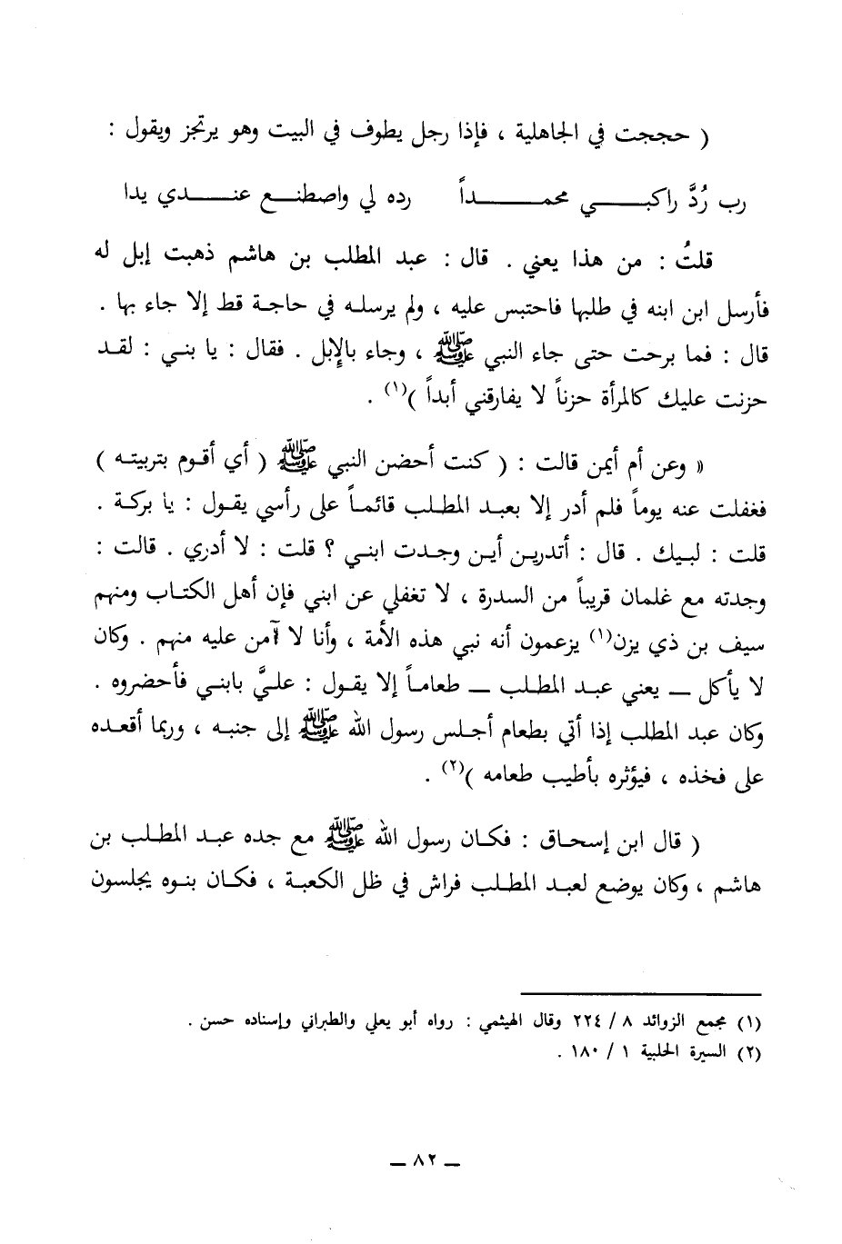 قلت: من هذا يعني. قال: عبد المطلب بن هاشم ذهبت إبل له فأرسل ابن ابنه في طلبها فاحتبس عليه، ولم يرسله في حاجة قط إلا جاء بها. قال: فما برحت حتى جاء النبي - صلى الله عليه وسلم -، وجاء بالإبل. فقال: يا بني: لقد حزنت عليك كالمرأة حزنا لا يفارقني أبدا) (¬1).