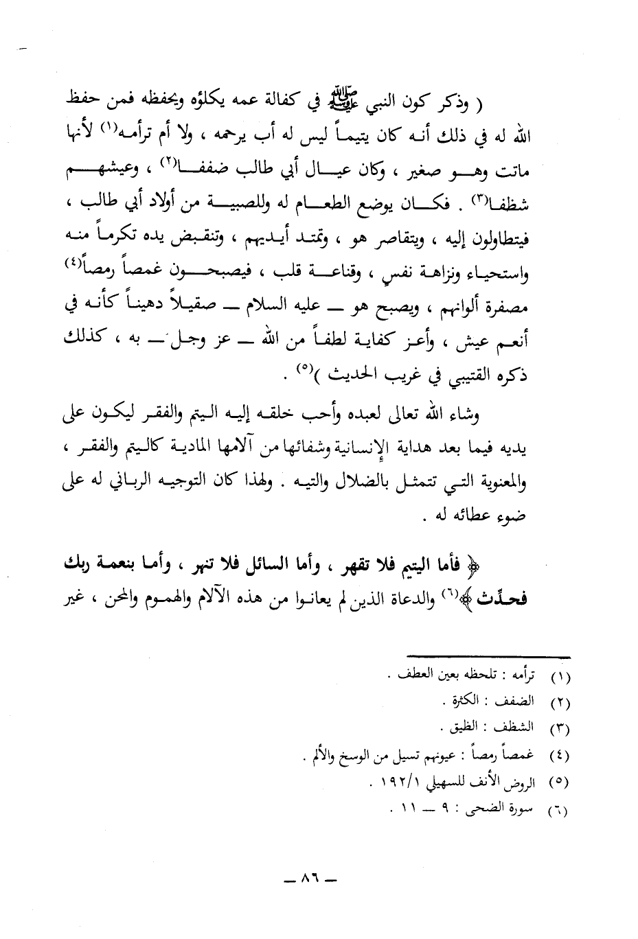 وشاء الله تعالى لعبده وأحب خلقه إليه اليتم والفقر ليكون على يديه فيما بعد هداية الإنسانية وشفائها من آلامها المادية كاليتم والفقر، والمعنوية التي تتمثل بالضلال والتيه. ولهذا كان التوجيه الرباني له على ضوء عطائه له.