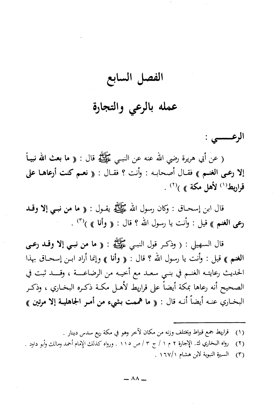 قال ابن إسحاق: وكان رسول الله - صلى الله عليه وسلم - يقول: ((ما من نبي إلا وقد رعى الغنم)) قيل:: ((وأنت يا رسول الله؟ قال: ((وأنا)) (¬3).