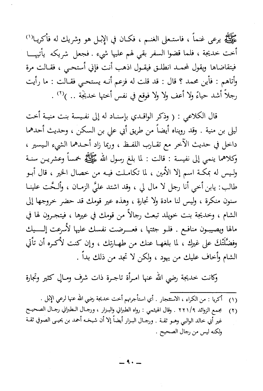 قال الكلاعي: (وذكر الواقدي بإسناد له إلى نفيسة بنت منية أخت ليلى بن منية. وقد رويناه أيضا من طريق أبي علي بن السكن، وحديث أحدهما داخل في حديث الآخر مع تقارب اللفظ، وربما زاد أحدهما الشيء اليسير، وكلاهما ينمي إلى نفيسة: قالت: لما بلغ رسول الله - صلى الله عليه وسلم - خمسا وعشرين سنة وليس له بمكة اسم إلا الأمين، لما تكاملت فيه من خصال الخير، قال أبو طالب: يابن أخي أنا رجل لا مال لي، وقد اشتد علي الزمان، وألحت علينا سنون منكرة، وليس لنا مادة ولا تجارة، وهذه عير قومك قد حضر خروجها إلى الشام، وخديجة بنت خويلد تبعث رجالا من قومك في عيرها، فيتجرون لها في مالها ويصيبون منافع. فلو جئتها، فعرضت نفسك عليها لأسرعت إليك وفضلتك على غيرك، لما بلغها عنك من طهارتك، وإن كنت لأكره أن تأتي الشام وأخاف عليك من يهود، ولكن لا تجد من ذلك بدا.