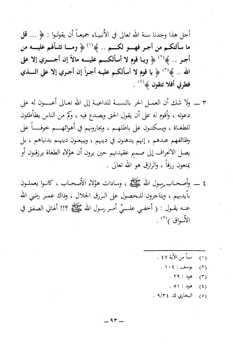 أجل هذا وجدنا سنة الله تعالى في الأنبياء جميعا أن يقولوا: {... قل ما سألتكم من أجر فهو لكم ..} (¬1) {وما تسألهم عليه من أجر ..} (¬2) {ويا قوم لا أسألكم عليه مالا إن أجري إلا على الله ..} (¬3) {يا قوم لا أسألكم عليه أجرا إن أجري إلا على الذي فطرني أفلا تعقلون} (¬4).