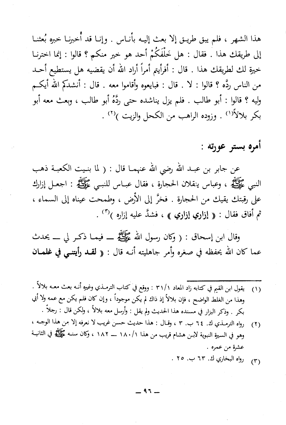 (¬1) يقول ابن القيم في كتابه زاد المعاد 1/ 31: ووقع في كتاب الترمذي وغيره أنه بعث معه بلالا. وهذا من الغلط الواضح، فإن بلالا إذ ذاك لم يكن موجودا، وإن كان فلم يكن مع عمه ولا أبي بكر. وذكر البزار في مسنده هذا الحديث ولم يقل: وأرسل معه بلالا، ولكن قال: رجلا.