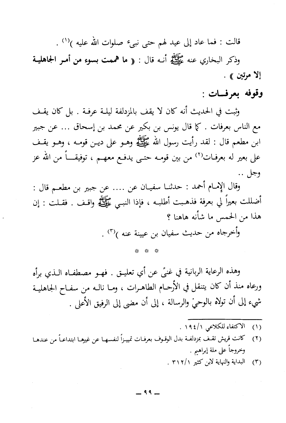 وثبت في الحديث أنه كان لا يقف بالمزدلفة ليلة عرفة. بل كان يقف مع الناس بعرفات. كما قال يونس بن بكير عن محمد بن إسحاق ... عن جبير ابن مطعم قال: لقد رأيت رسول الله - صلى الله عليه وسلم - وهو على دين قومه، وهو يقف على بعير له بعرفات (¬2) من بين قومه حتى يدفع معهم، توفيقا من الله عز وجل ..
