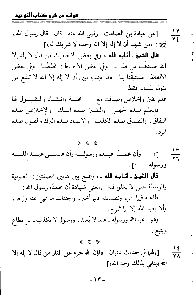 12: 24 [عن عبادة بن الصامت -رضي الله عنه- قال: قال رسول الله -صلى الله عليه وسلم-: "من شهد أن لا إله إلا الله وحده لا شريك له".]