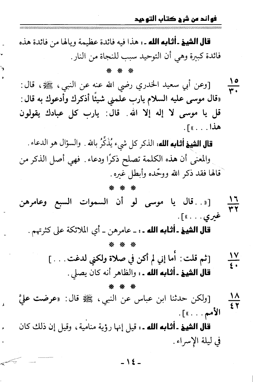 15: 30 [وعن أبي سعيد الخدري -رضي الله عنه- عن النبي -صلى الله عليه وسلم- قال: "قال موسى عليه السلام: يا رب علِّمني شيئاً أذكرك وأدعوك به، قال: قل يا موسى: لا إله إلا الله. قال: يا رب كل عبادك يقولون هذا.."] .
