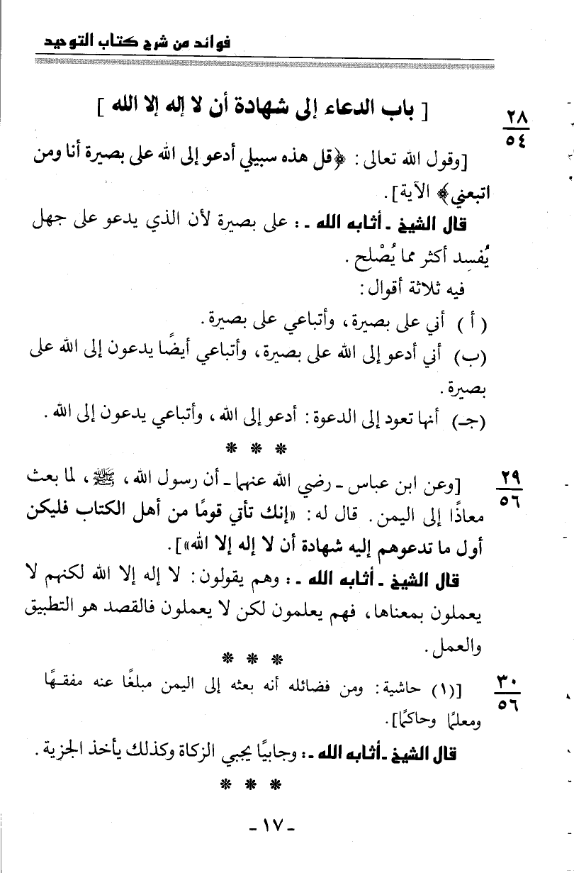 29: 56 [وعن ابن عباس –رضي الله عنهما-: أن رسول الله -صلى الله عليه وسلم- لما بعث معاذاً إلى اليمن قال له: "إنك تأتي قوماً من أهل الكتاب فليكن أول ما تدعوهم إليه شهادة أن لا إله إلا الله"] .