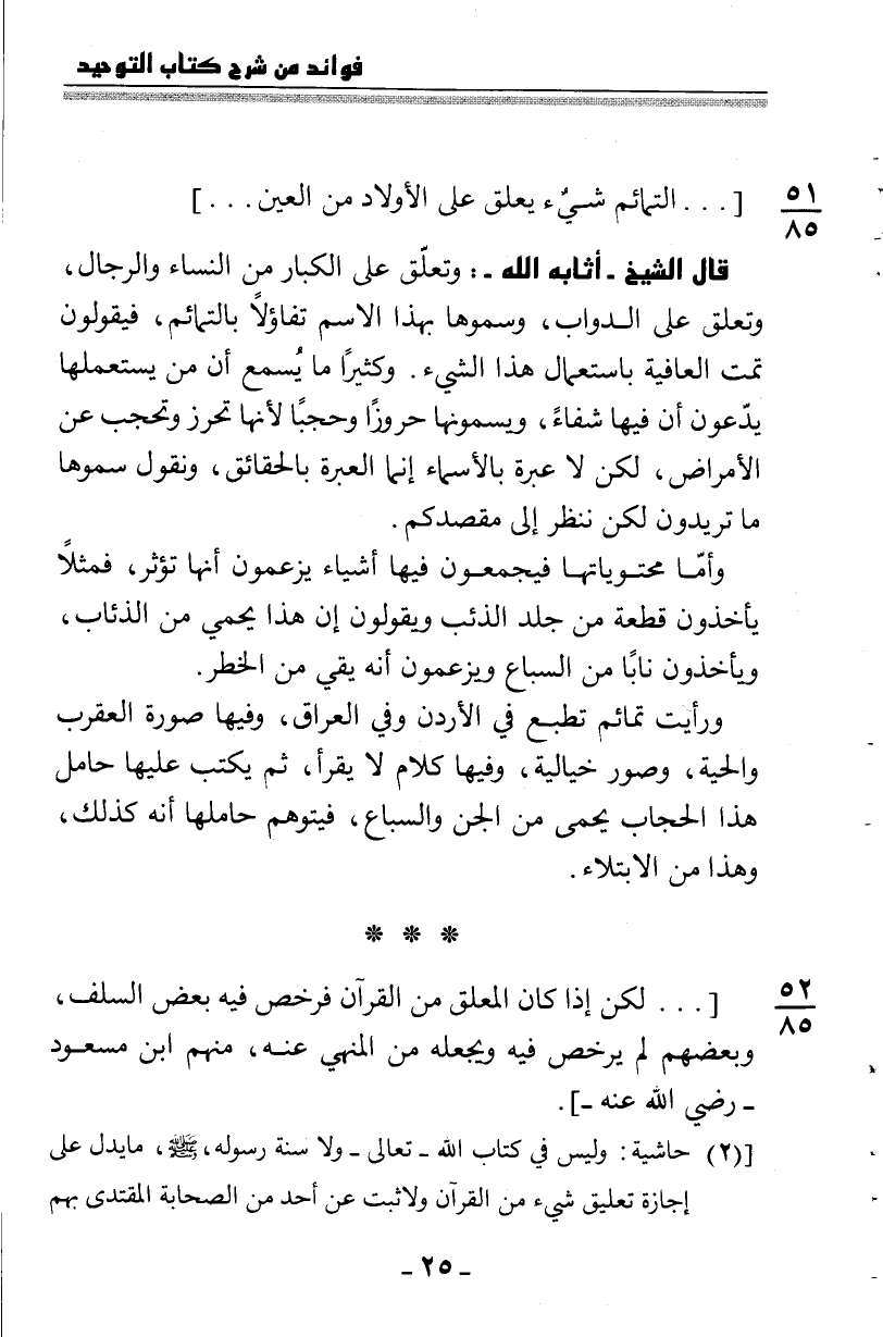 52: 85 [ ... لكن إذا كان المعلَّق من القرآن فرخَّص فيه بعضُ السلف، وبعضهم لم يرخِّص فيه ويجعله من المنهي عنه، منهم ابن مسعود -رضي الله عنه-] .