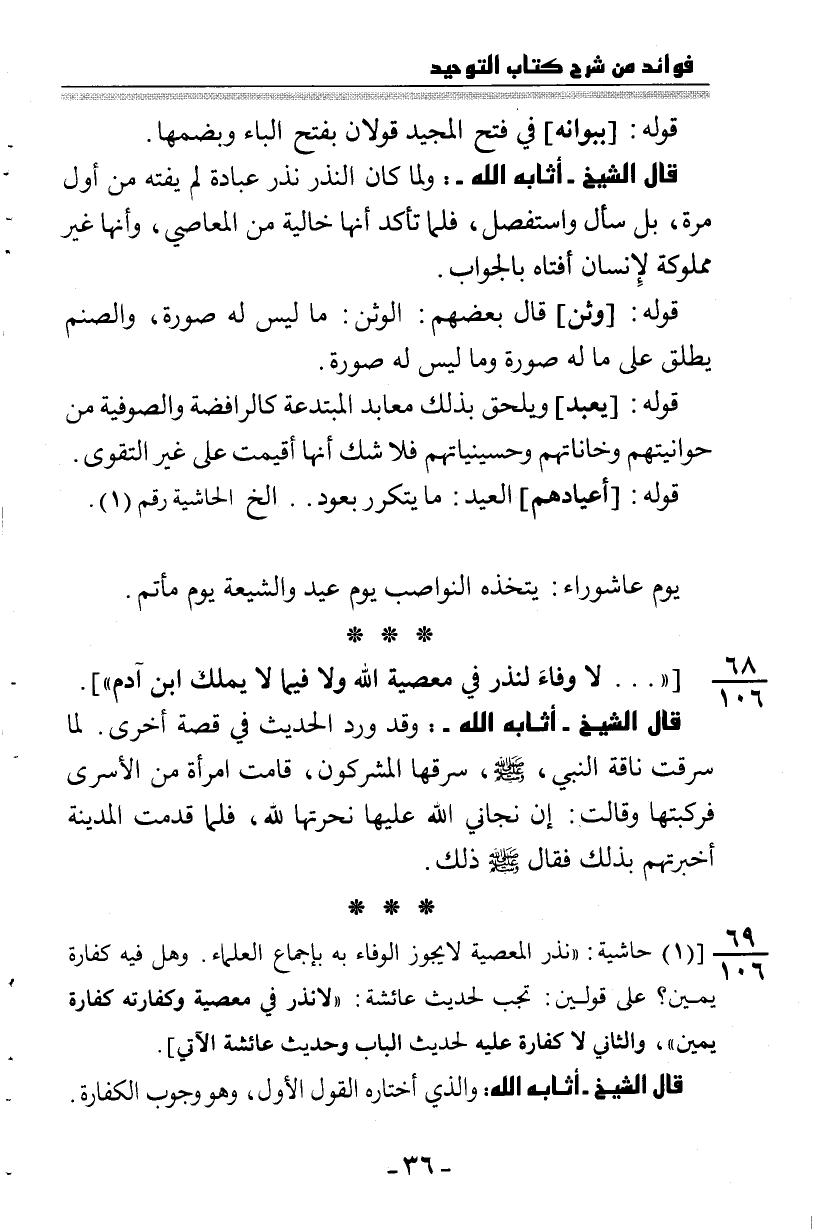 69: 106 [1 حاشية: "نذر المعصية لا يجوز الوفاء به بإجماع العلماء. وهل فيه كفارة يمين؟ على قولين: تجب لحديث عائشة: "لا نذر في معصية وكفارته كفارة يمين" والثاني: لا كفارة عليه لحديث الباب وحديث عائشة الآتي] .