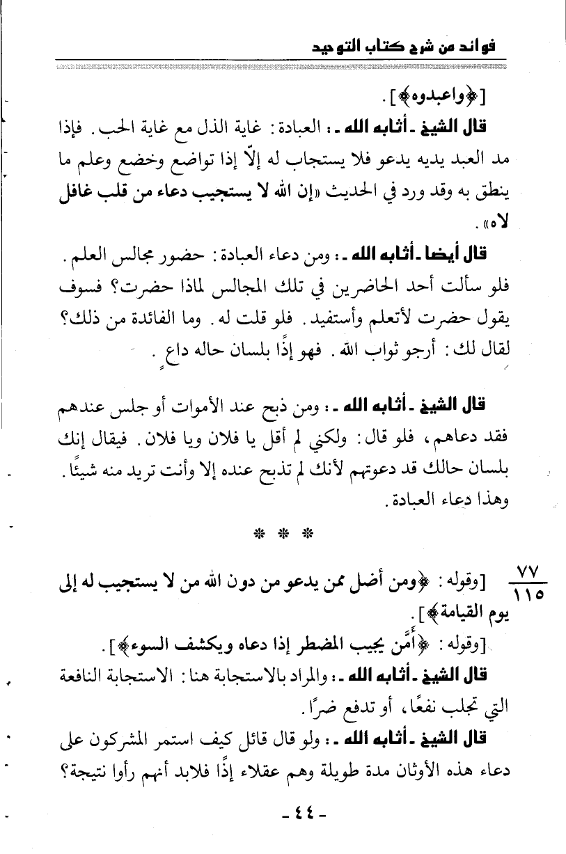 قال الشيخ أثابه الله: العبادة: غاية الذل مع غاية الحب. فإذا مد العبد يديه يدعو فلا يستجاب له إذا تواضع وخضع وعلم ما ينطق به وقد ورد في الحديث "إن الله لا يستجيب داء من قلب غافل لاه".