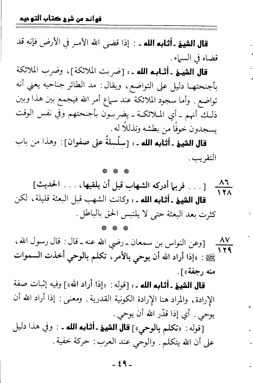 87: 129 [وعن النواس بن سمعان -رضي الله عنه- قال: قال رسول الله -صلى الله عليه وسلم-: "إذا أراد الله تعالى أن يوحي بالأمر تكلم بالوحي أخذت السماوات منه رجفة"] .