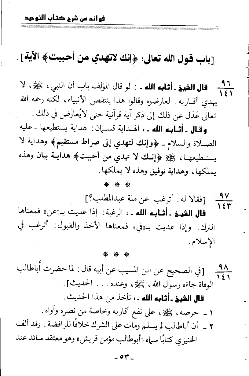 96: 141 قال الشيخ أثابه الله: لو قال المؤلف باب أن النبي –صلى الله عليه وسلم- لا يهدي أقاربه. لعارضوه وقالوا هذا ينتقص من الأنبياء، لكنه رحمه الله تعالى عدل عن ذلك إلى ذكر آية قرآنية حتى لا يُعارض في ذلك.