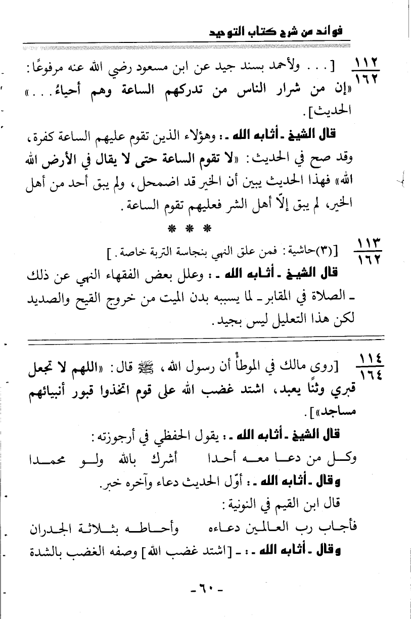 114: 164 [روى مالك في الموطأ: أن رسول الله –صلى الله عليه وسلم- قال: "اللهم لا تجعل قبري وثناً يُعبد. اشتد غضبُ الله على قوم اتخذوا قبور أنبيائهم مساجد"] .