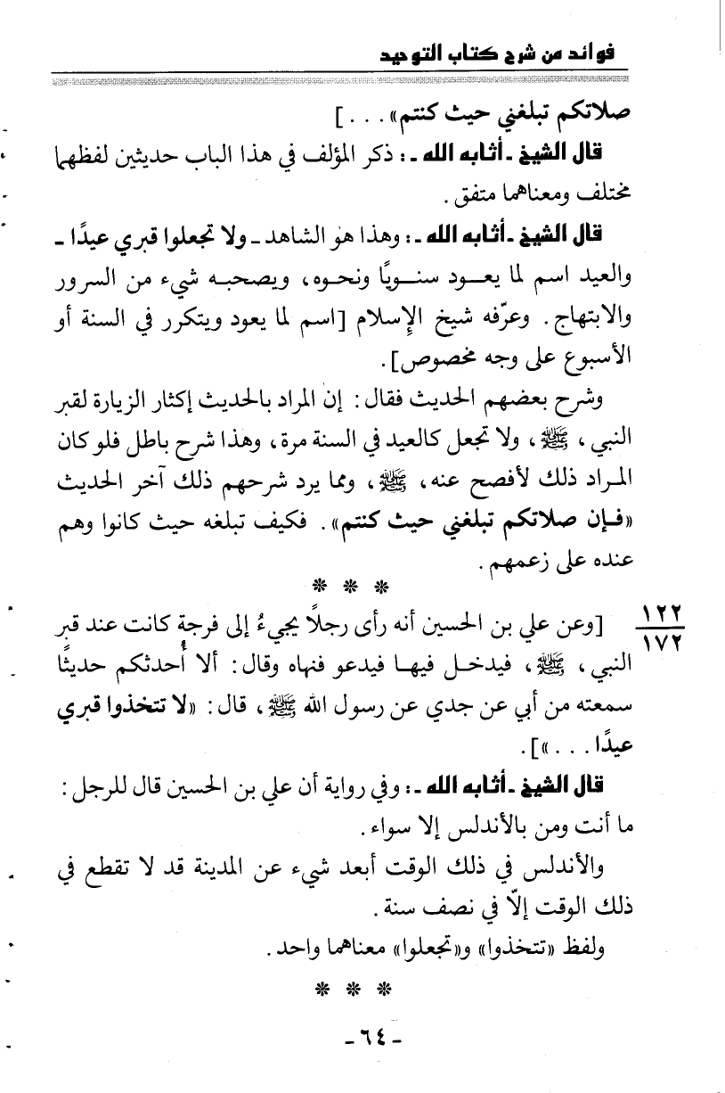 122: 172 [وعن علي بن الحسين: أنه رأى رجلاً يجيء إلى فُرجة كانت عند قبر النبي –صلى الله عليه وسلم- فيدخل فيها فيدعو فنهاه وقال: ألا أحدثكم حديثاً سمعته من أبي عن جدي عن رسول الله –صلى الله عليه وسلم- قال: "لا تتخذوا قبري عيداً ... "] .