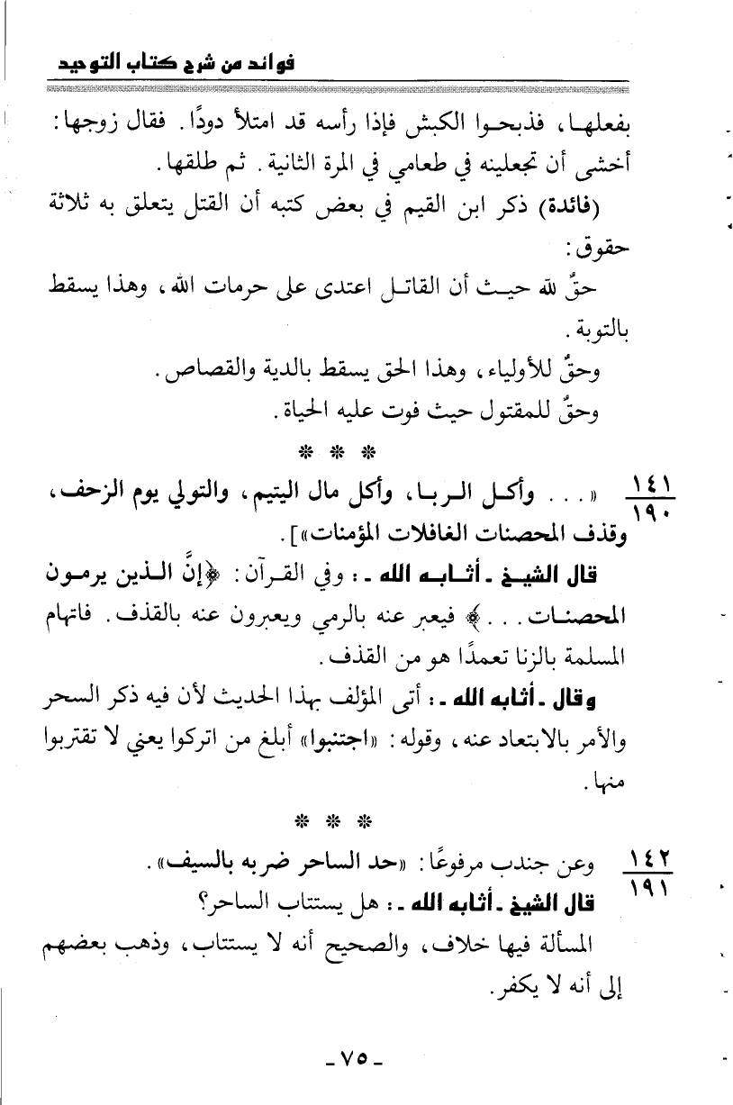 142: 191 وعن جندب مرفوعاً: "حد الساحر ضربة بالسيف".