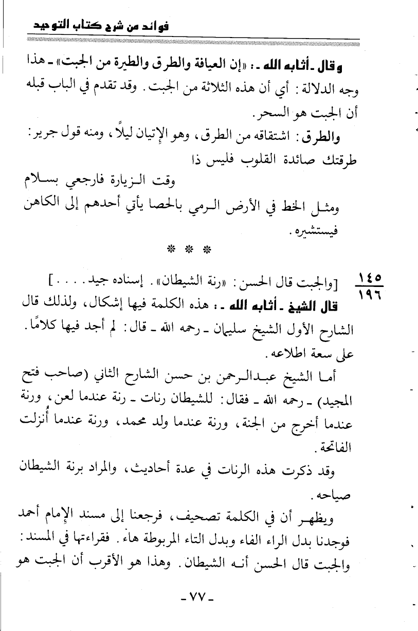 وقال أثابه الله: "إن العيافة والطيرة من الجبت" -هذا وجه الدلالة: أي أن هذه الثلاثة من الجبت. وقد تقدم في الباب قبله أن الجبت هو السحر.