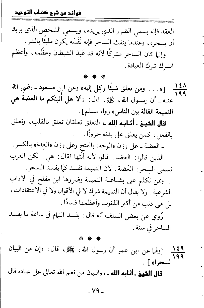 149: 199 [ولهما عن ابن عمر أن رسول الله - صلى الله عليه وسلم- قال: "إن من البيان لسحراً"] .