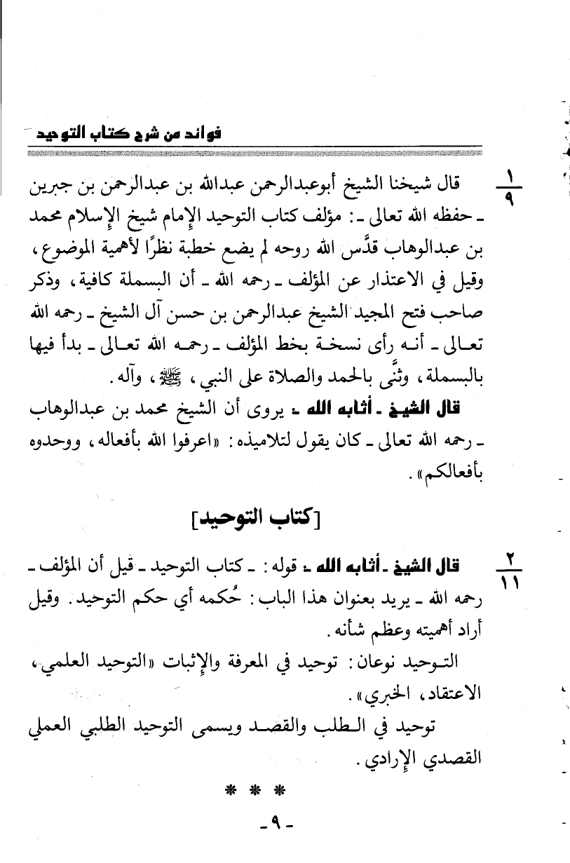 1: 9 قال شيخنا الشيخ أبو عبد الرحمن عبد الله بن عبد الرحمن بن جبرين –حفظه الله تعالى-: مؤلف كتاب التوحيد الإمام شيخ الإسلام محمد بن عبد الوهاب قدّس الله روحه لم يضع خطبةً نظراً لأهمية الموضوع، وقيل في الاعتذار عن المؤلف –رحمه الله- أن البسملة كافية، وذكر صاحب فتح المجيد الشيخ عبد الرحمن بن حسن آل الشيخ –رحمه الله- أنه رأى نسخة بخط المؤلف –رحمه الله تعالى- بدأ فيها بالبسملة، وثنّى بالحمد والصلاة على النبي – صلى الله عليه وسلم-، وآله.