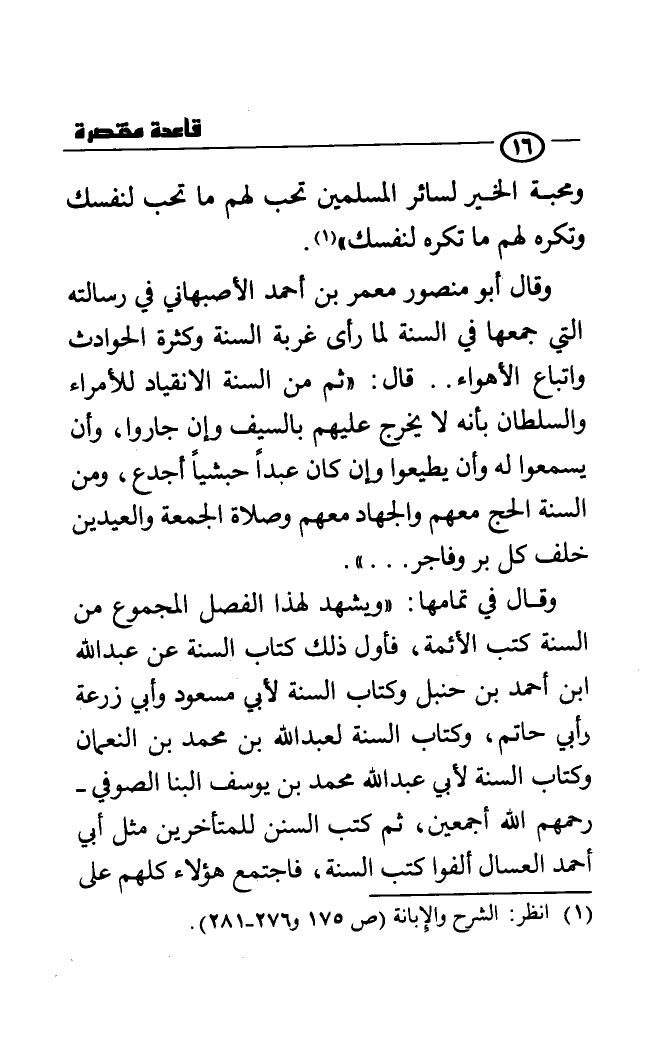 وقال في تمامها: "ويشهد لهذا الفصل المجموع من السنة كتب الأئمة، فأول ذلك كتاب السنة عن عبد الله بن أحمد بن حنبل وكتاب السنة لأبي مسعود وأبي زرعة وأبي حاتم، وكتاب السنة لعبد الله بن محمد بن النعمان وكتاب السنة لأبي عبد الله محمد بن يوسف البنا الصوفي- رحمهم الله أجمعين، ثم كتب السنن للمتأخرين مثل أبي أحمد العسال، ألفوا كتب السنة، فاجتمع هؤلاء كلهم على